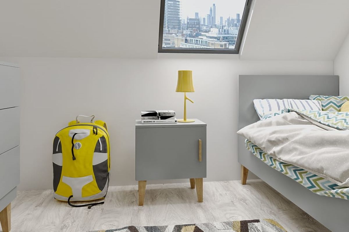 Table de chevet moderne KUBI pour chambre d'enfants. La porte est double face, cela ne dépend que de vous de quel côté vous la montez. L'espace intérieur derrière la porte de chevet est divisé en 1 partie par 1 étagère pratique. En pratique, vous disposez de 2 étagères pour ranger les choses.