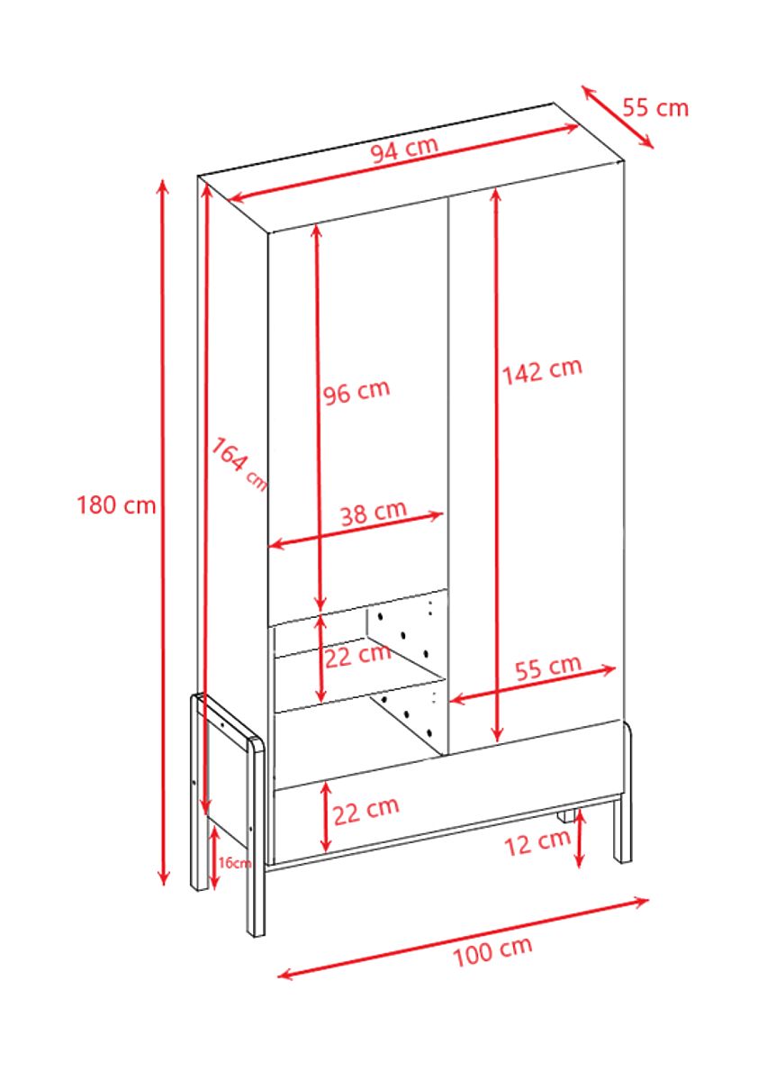L'intérieur dcomprend un compartiment spacieux avec une barre de penderie et cinq étagères, dont deux sont ouvertes, offrant un accès pratique aux objets du quotidien. Au bas se trouve un tiroir pratique qui se ferme.