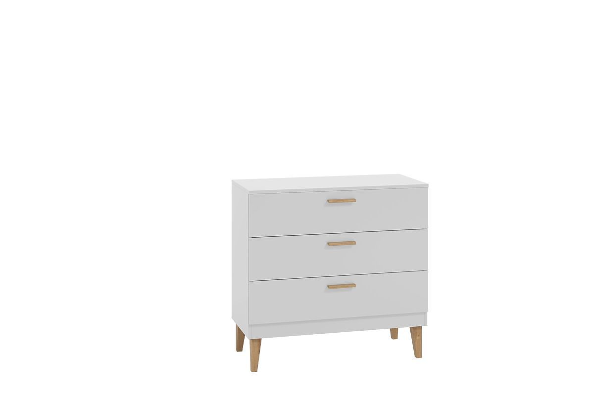 La commode KUBI blanche comme neige est fabriquée en planche pour meubles de haute qualité. Les pieds en chêne massif accentuent le style scandinave moderne, qui s'accordera parfaitement à tout intérieur.