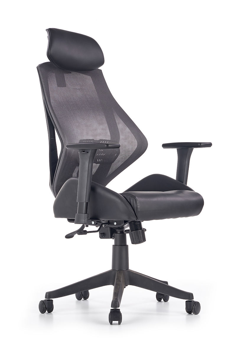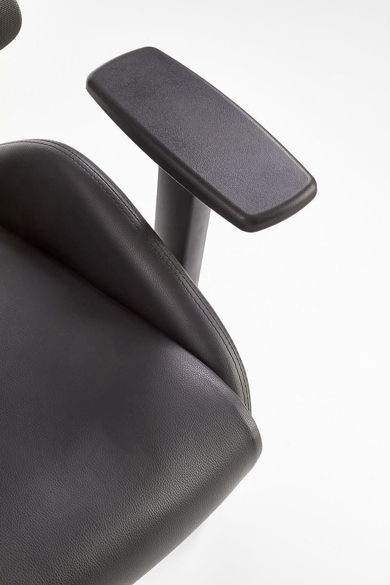 Le mécanisme Multiblock offre la possibilité de basculer, dont vous pouvez régler la rigidité vous-même. Le dossier ergonomiquement conçu et l'appui-tête sont recouverts d'un filet respirant, tandis que l'assise de la chaise est rembourrée de cuir écologique noir. Le dossier est également équipé d'un support lombaire qui assure une assise saine, accompagné d'accoudoirs réglables. La structure est fabriquée en plastique robuste.