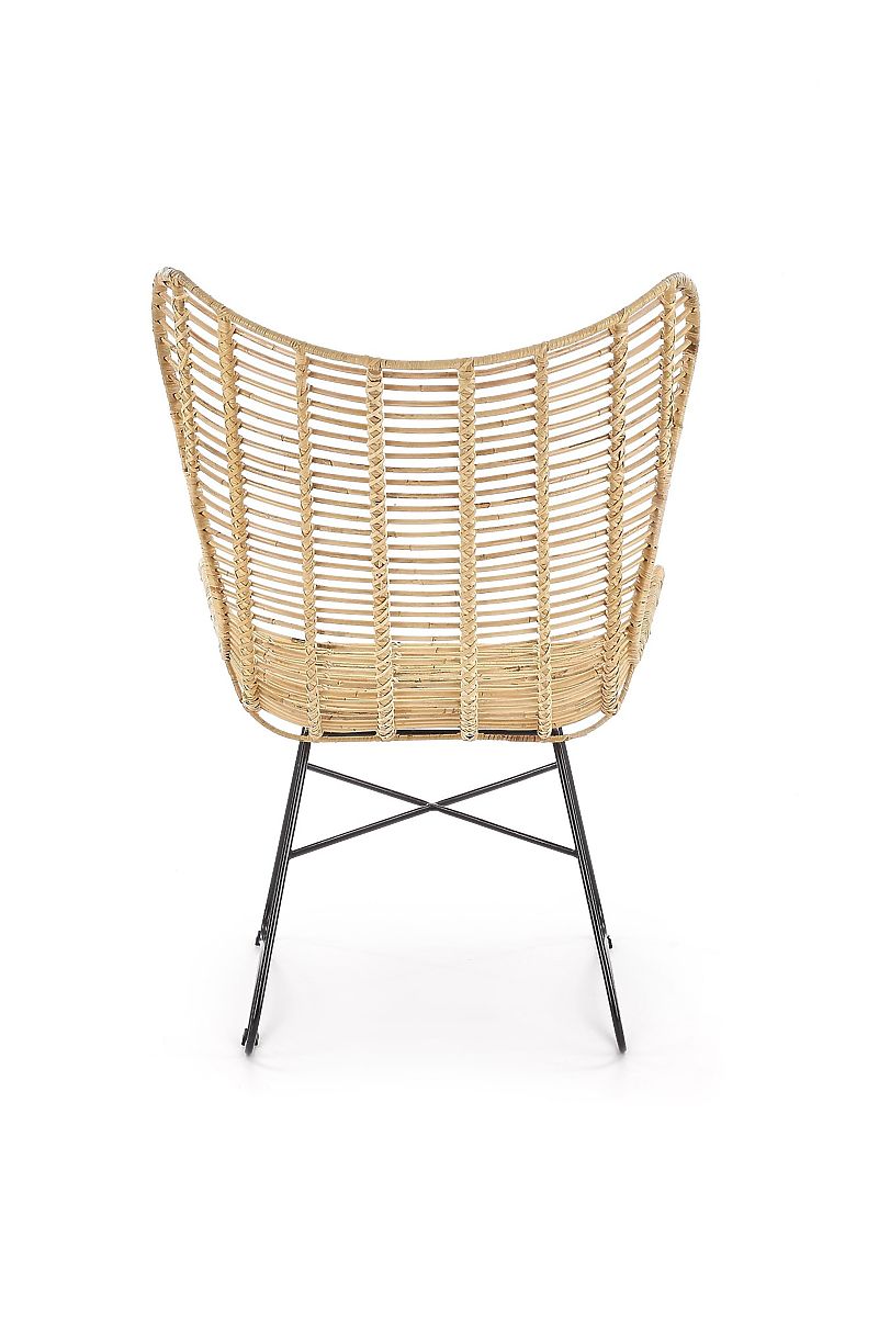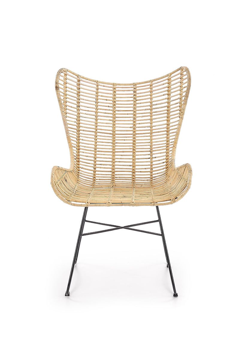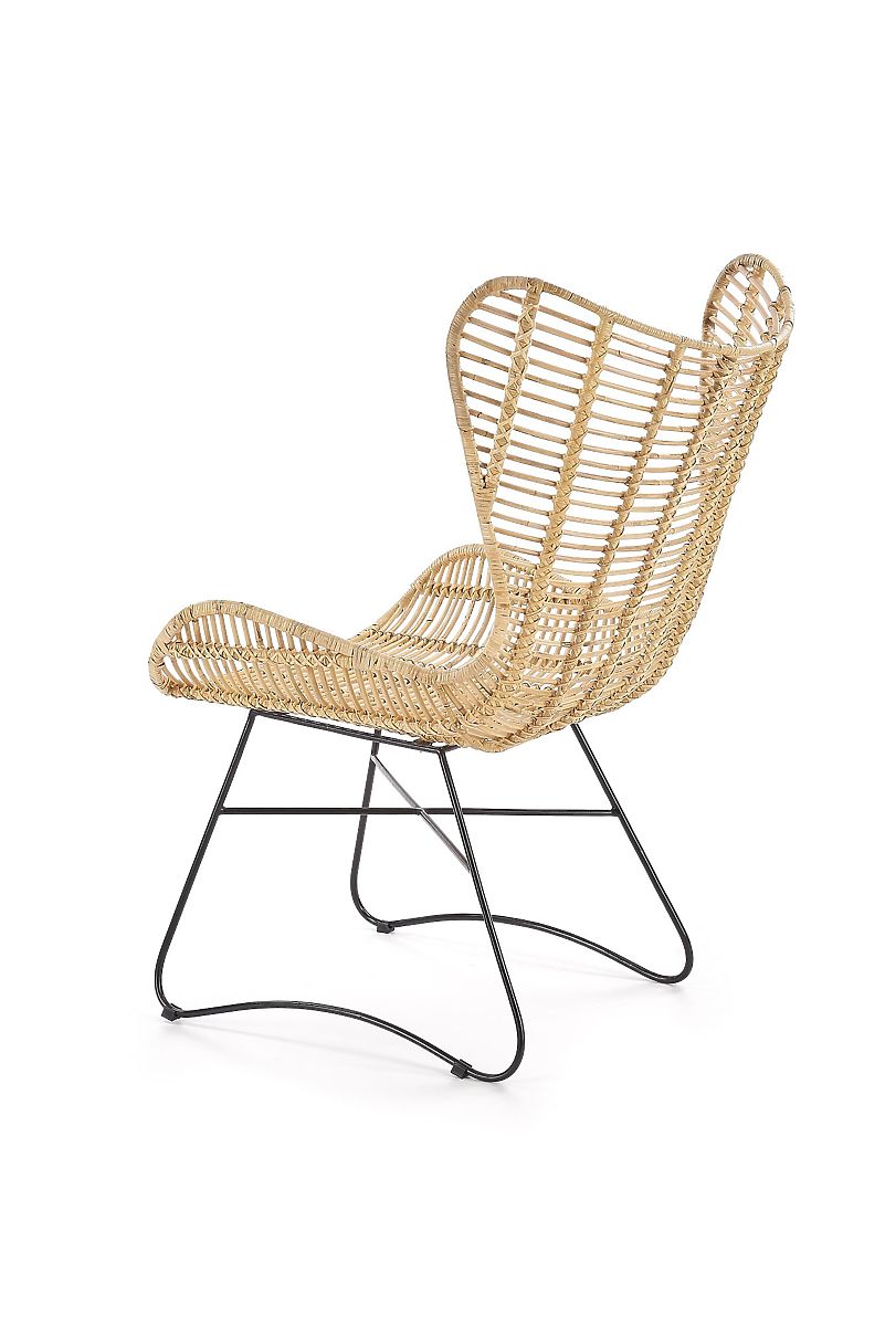 L'assise et le dossier sont tressés en rotin naturel. La structure est fabriquée en acier peint par poudrage de couleur noire.