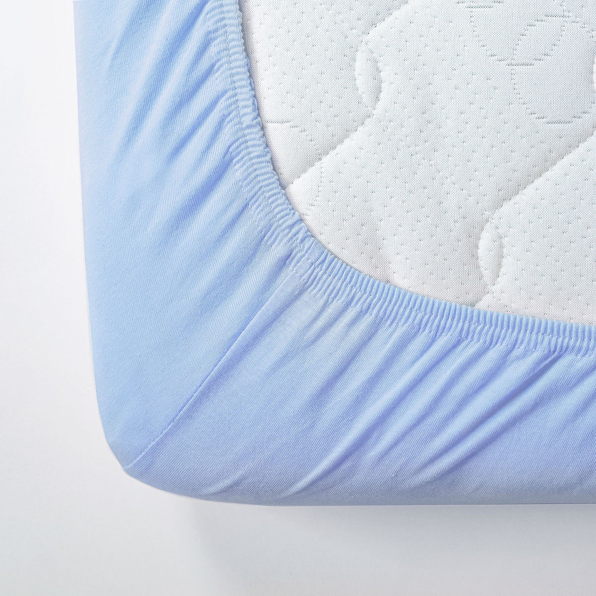 Drap-housse en coton de couleur bleu clair . Le drap est tissé à partir de fils de coton de haute qualité , c'est pourquoi il conserve ses propriétés même après des lavages répétés.
