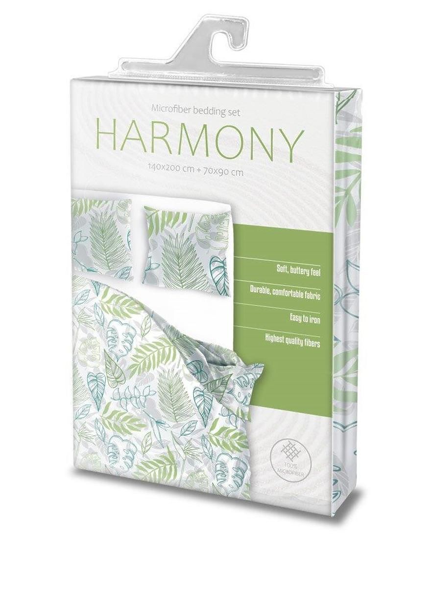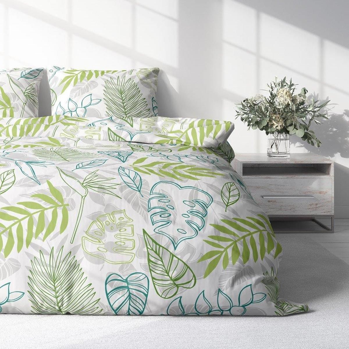 La literie comprend une housse de couette 140 x 200 cm et une taie d'oreiller 70 x 90 cm . Les couvertures présentent le même motif de grandes feuilles de différents types de plantes dans de multiples nuances de vert des deux côtés. Des feuilles grises discrètes sont encore cachées sous les feuilles vertes et tout cela repose sur un fond blanc.