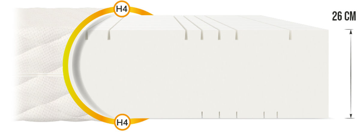 Avec un matelas en mousse Goya Max Plus de haute qualité d' une hauteur de 26 cm, votre lit deviendra l'endroit le plus confortable de loin. Grâce à une série de découpes transversales et longitudinales , le matelas double face est divisé en 7 zones . Le résultat est une augmentation significative de la plasticité, ce qui offre un excellent soutien à la colonne vertébrale .