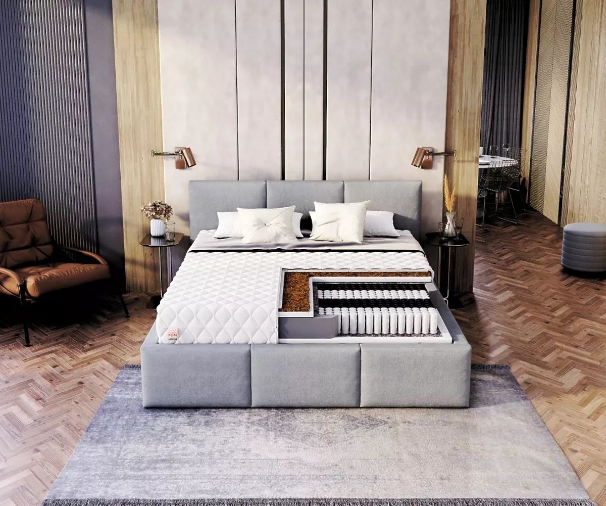Le noyau du matelas est constitué de ressorts ensachés, chacun étant placé dans une poche spéciale. Les ressorts ne sont pas interconnectés et fonctionnent indépendamment sous charge. Grâce à sa forme, il s'adapte à la silhouette de la personne et assure ainsi un excellent maintien de la colonne vertébrale. Le matelas est divisé en 7 zones de soutien, chaque zone représentant un soutien adéquat pour une partie donnée du corps. Le matelas FAMILY est un modèle double face grâce à différents degrés de dureté de chaque côté du matelas, ce qui permet de l'adapter facilement à vos préférences personnelles. Un côté du matelas est constitué de mousse pure et d'un insert en noix de coco, et de l'autre côté se trouve une couche de mousse pure. La mousse flexible résiste à la déformation et empêche le développement d'acariens et autres micro-organismes. La noix de coco naturelle est respirante et possède des propriétés anti-allergiques. Un matériau séparateur a été inséré entre les ressorts et la mousse. Il s'agit d'un feutre naturel qui peut prolonger considérablement la durée de vie du matelas et renforcer sa structure. Les matériaux utilisés sont sûrs, durables et résistants à l'usure. En conséquence, le matelas FAMILY servira pendant de nombreuses années.