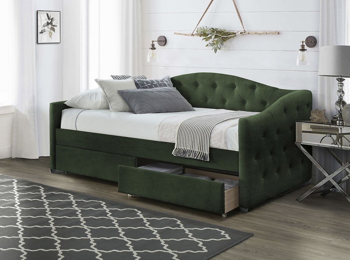 La tête de lit en forme est un élément esthétique qui la distingue et lui confère un élément de design intéressant. Le lit deviendra une excellente pièce maîtresse de votre chambre et attirera certainement l'attention. Le matelassage sur la tête du lit et sur les côtés confère au meuble un aspect luxueux et un attrait. La couleur vert foncé apporte une sensation de calme et d'élégance à la chambre. Cette couleur crée une atmosphère agréable pour le sommeil et la détente.