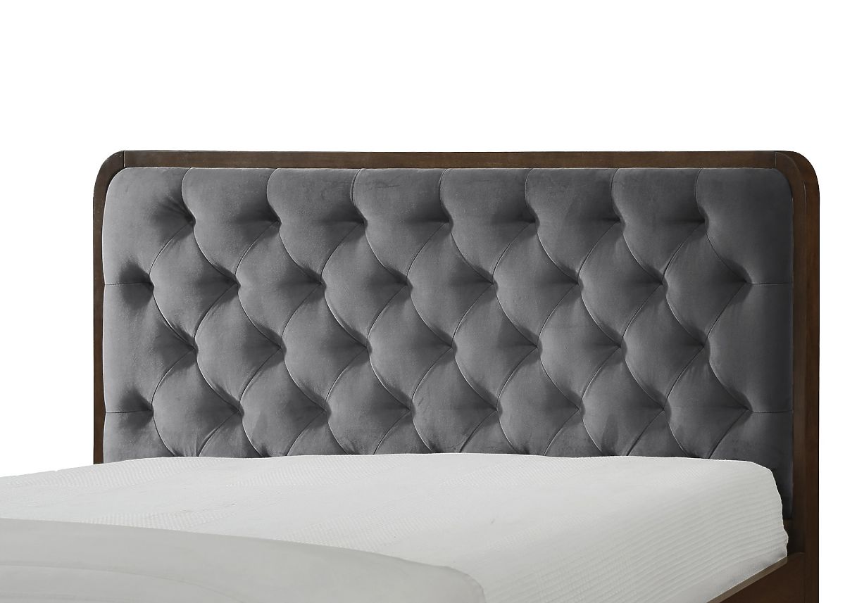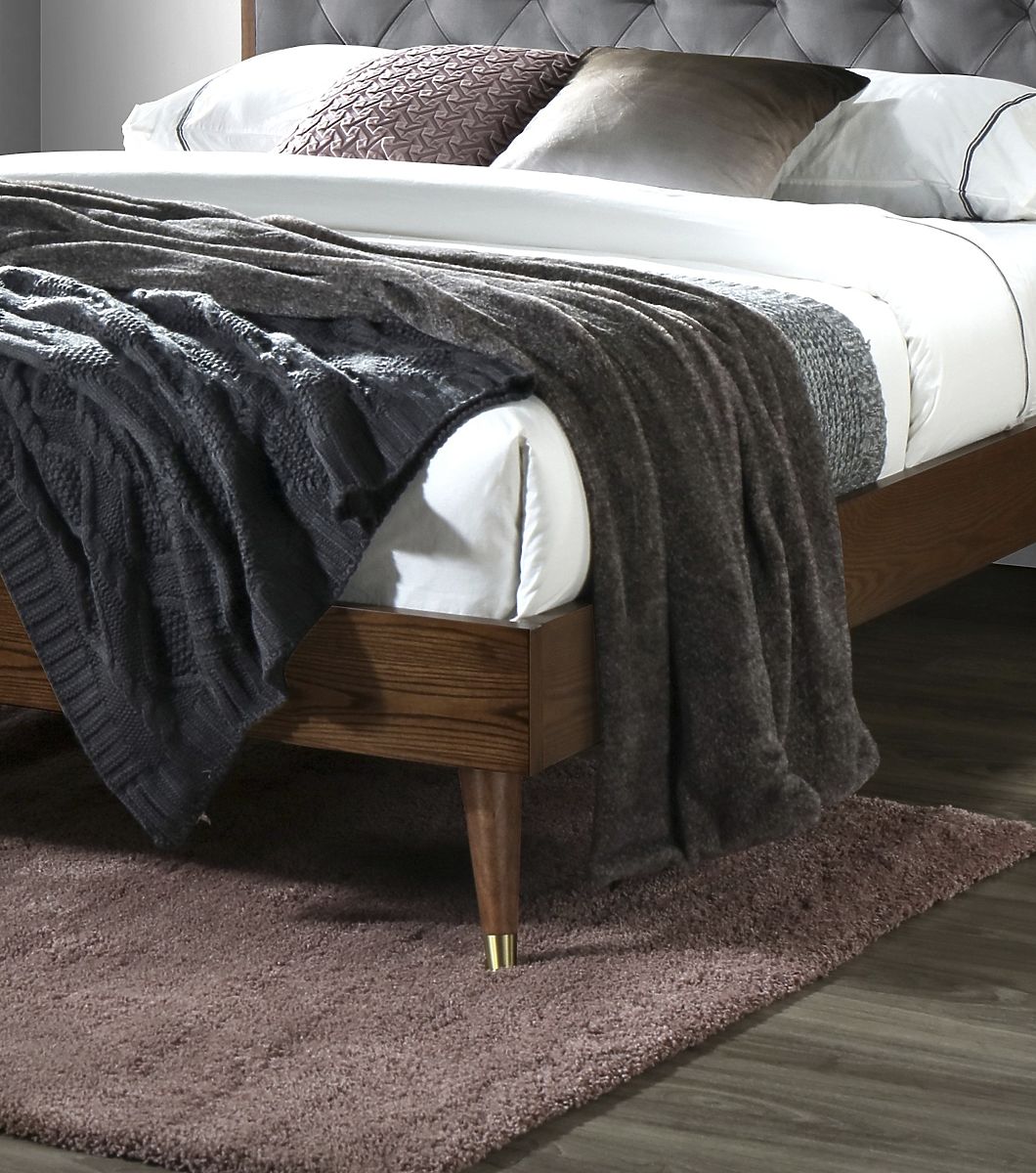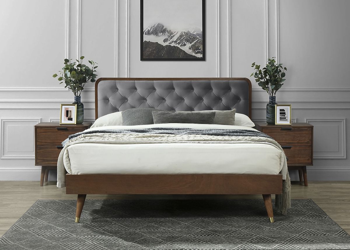 Le lit CASSIDY au style rétro avec une tête de lit capitonnée et une combinaison de tissu fendu et de bois est un meuble original pour votre chambre. Le design .. plus