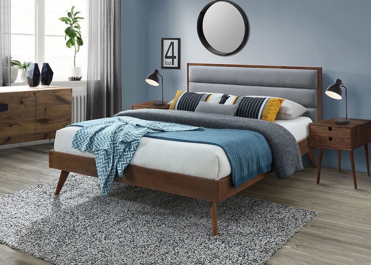 Le bois sombre du lit ORLANDO associé au revêtement gris ajoute de l'élégance et un look moderne. Cette combinaison de couleurs et de matières crée un ensemble harmonieux. Les pieds en bois élégants confèrent au lit un caractère unique et soulignent son aspect naturel.