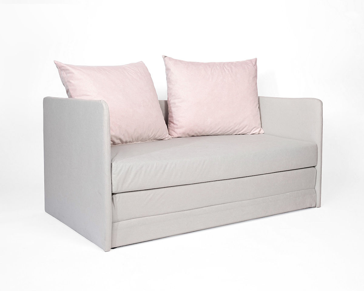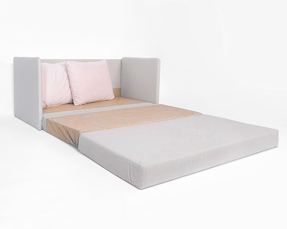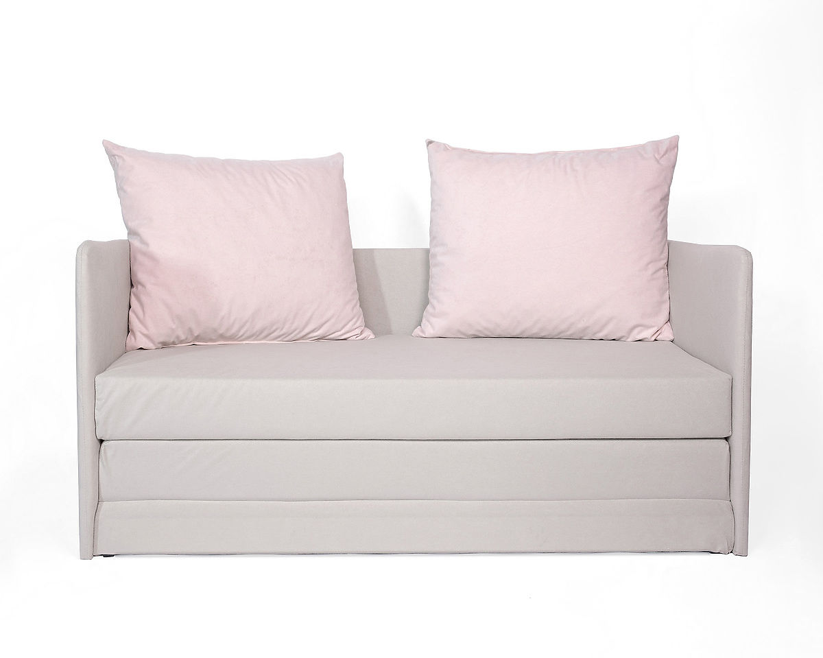 Canapé-lit gris clair avec coussins rose poudré pour chambres de filles. .. plus