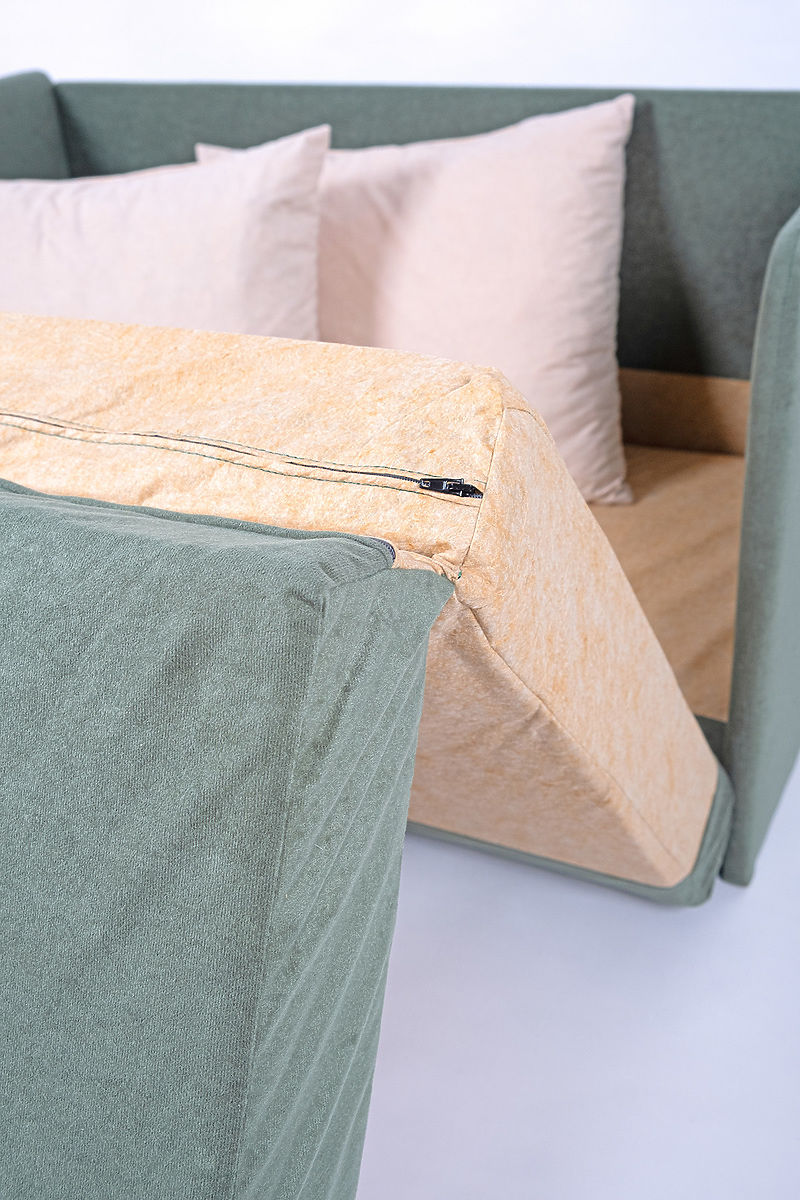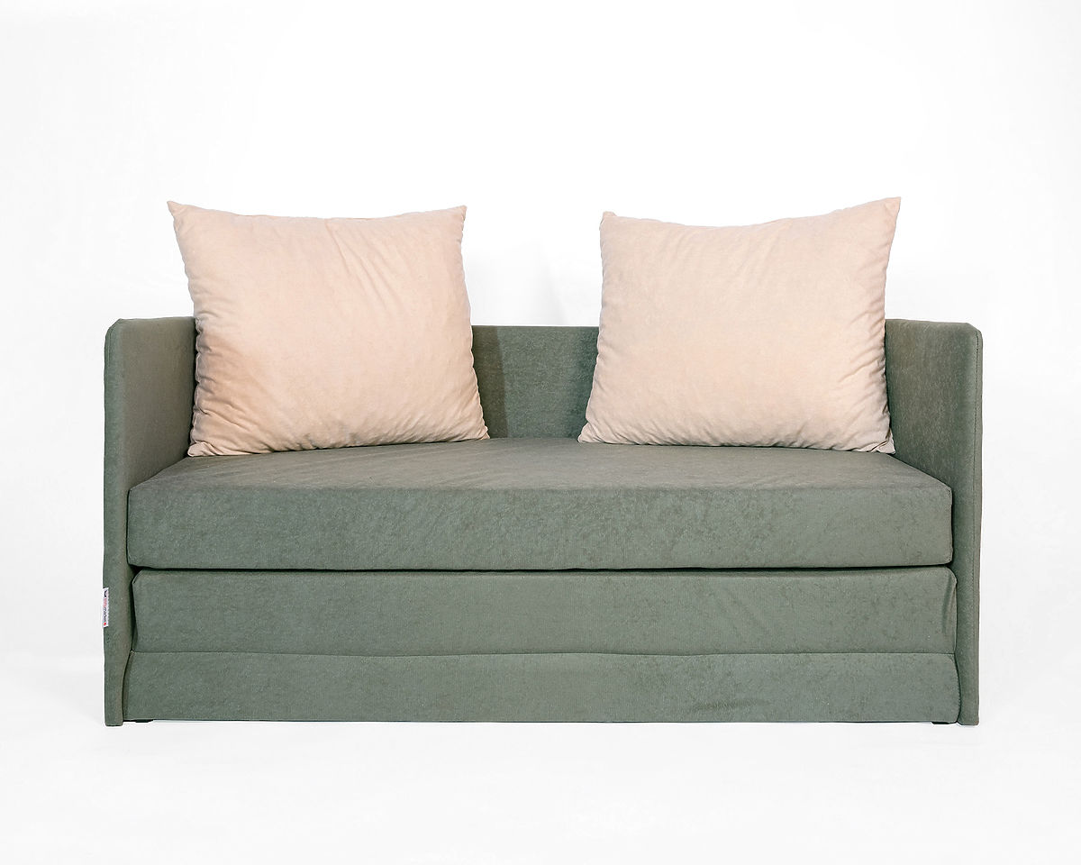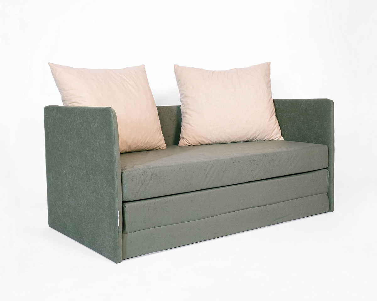 Le canapé-lit Jack pratique en couleur vert foncé avec des coussins beiges s'intègre parfaitement aussi bien dans une chambre de fille que de garçon.