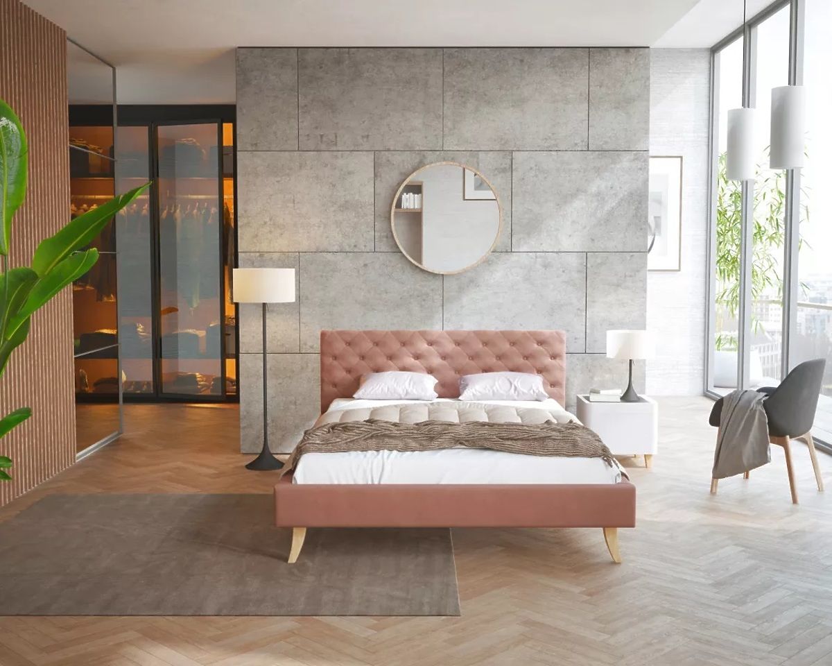 Le matériau de revêtement du lit en tissu est un velours vieux rose Trinity. Il se distingue par sa structure douce et en même temps par sa haute résistance, même à la lumière du soleil. Il est doux, moelleux et agréable au toucher. Il est également très résistant à l'abrasion et au boulochage. Vous serez séduit par son apparence moderne et les coutures décoratives de la tête de lit.