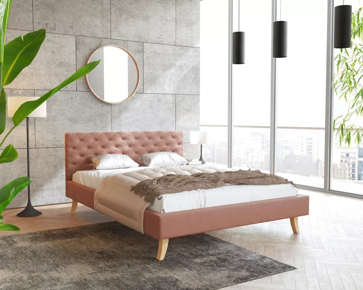 Le matériau de revêtement du lit en tissu est un velours vieux rose Trinity. Il se caractérise par une structure fine et en même temps une grande résistance même aux rayons du soleil. Il est doux, moelleux et agréable au toucher. Il est également très résistant à l'abrasion et au boulochage. Vous serez séduit par son apparence moderne et les coutures décoratives de la tête de lit.