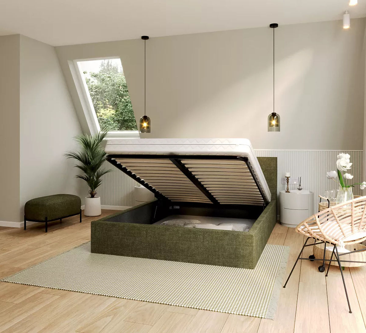 Lit rembourré TULSA de taille 140 x 200 cm et de couleur vert olive. Ce lit allie beau design, confort et praticité. La tête de lit rembourrée ajoute douceur et élégance à la pièce, créant un look harmonieux et agréable. Grâce à sa taille idéale de 140 x 200 cm, le lit offre suffisamment d'espace pour que deux personnes puissent dormir confortablement. La couleur vert olive est souvent associée au calme, à la stabilité et à la nature, ce qui en fait un choix populaire pour les intérieurs, surtout si vous souhaitez apporter une sensation agréable et apaisante à la pièce.