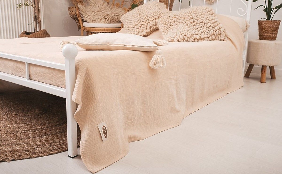 Couvre-lit en mousseline 240x210 cm. Il est léger, agréable et doux au toucher. Il possède une excellente respirabilité et la capacité de réguler la température. Il ne nécessite pas de repassage, a toujours un effet esthétique et donne à la chambre un aspect cosy.
