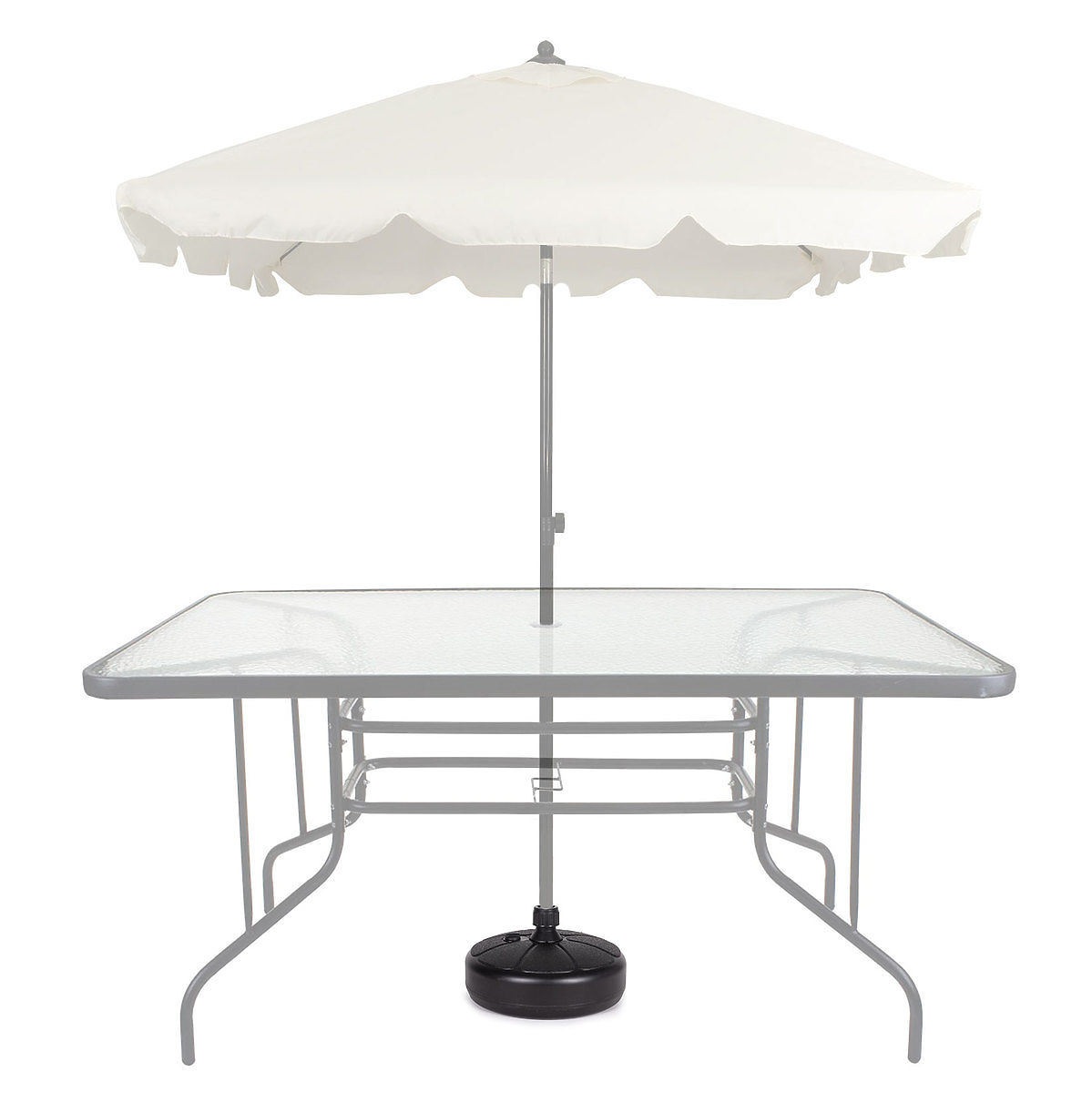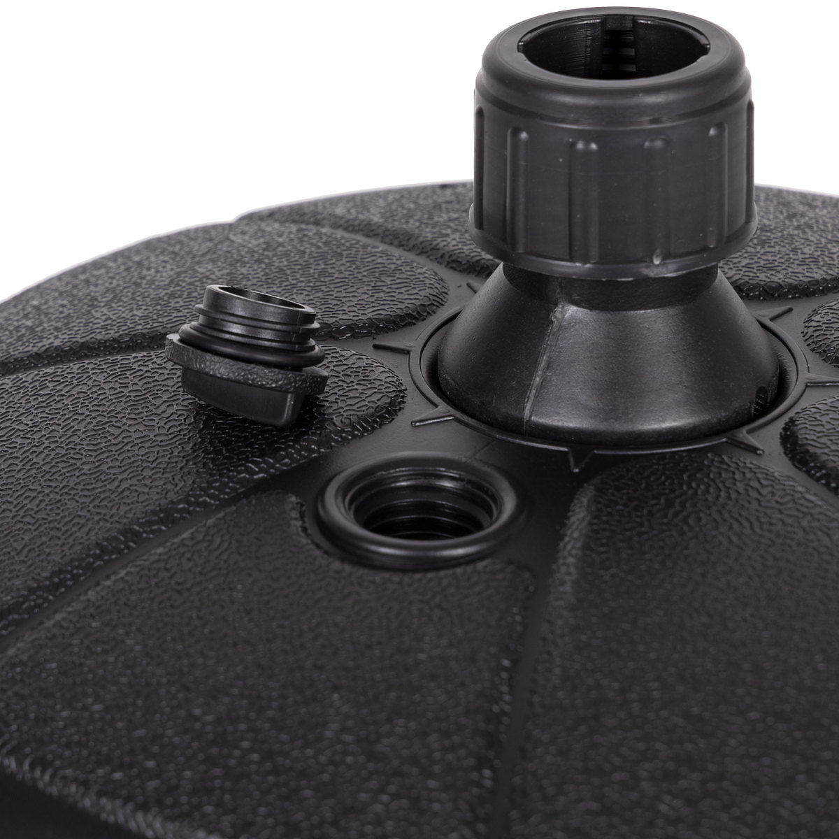Il y a un bouchon amovible dans la partie supérieure de la base, après l'avoir dévissé, remplissez la base d'eau. Une cartouche remplie d'eau pèse environ 13 kg, ce qui constitue une charge de stabilisation idéale pour le parapluie.