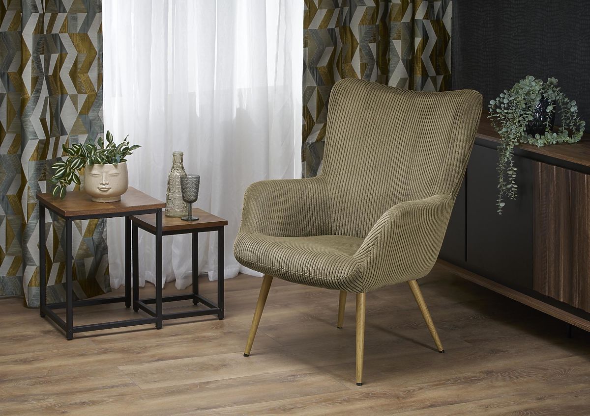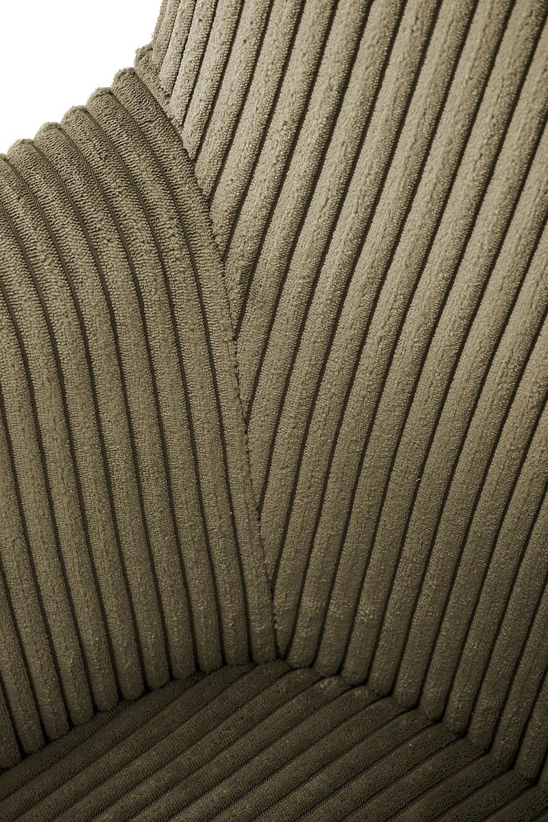 Le velours côtelé de couleur olive donne au fauteuil un aspect doux et sophistiqué. Ce tissu est non seulement agréable au toucher, mais également résistant et facile d'entretien, assurant ainsi une longue durée de vie à votre chaise.