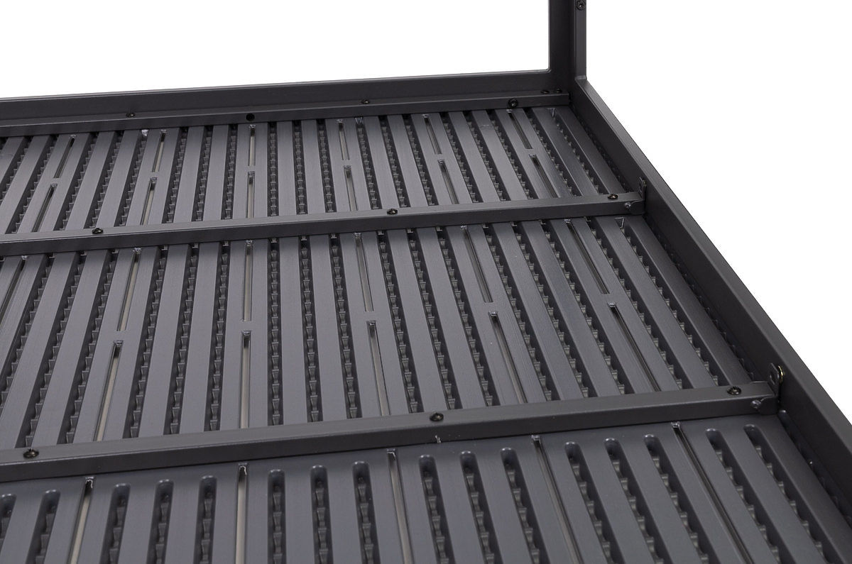 CONSTRUCTION SOLIDELa structure est fabriquée à partir de profils métalliques qui garantissent que l'ensemble de la construction est stable et ne se déforme pas comme les structures en plastique. Le plateau est renforcé par des profils transversaux supplémentaires en dessous, lui conférant rigidité et solidité adéquates.