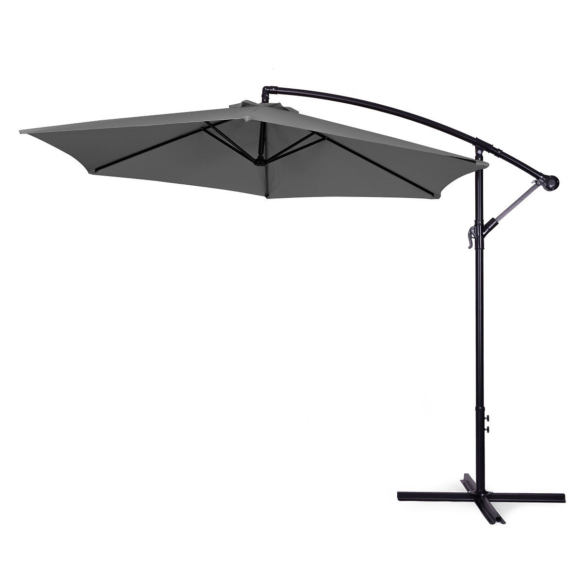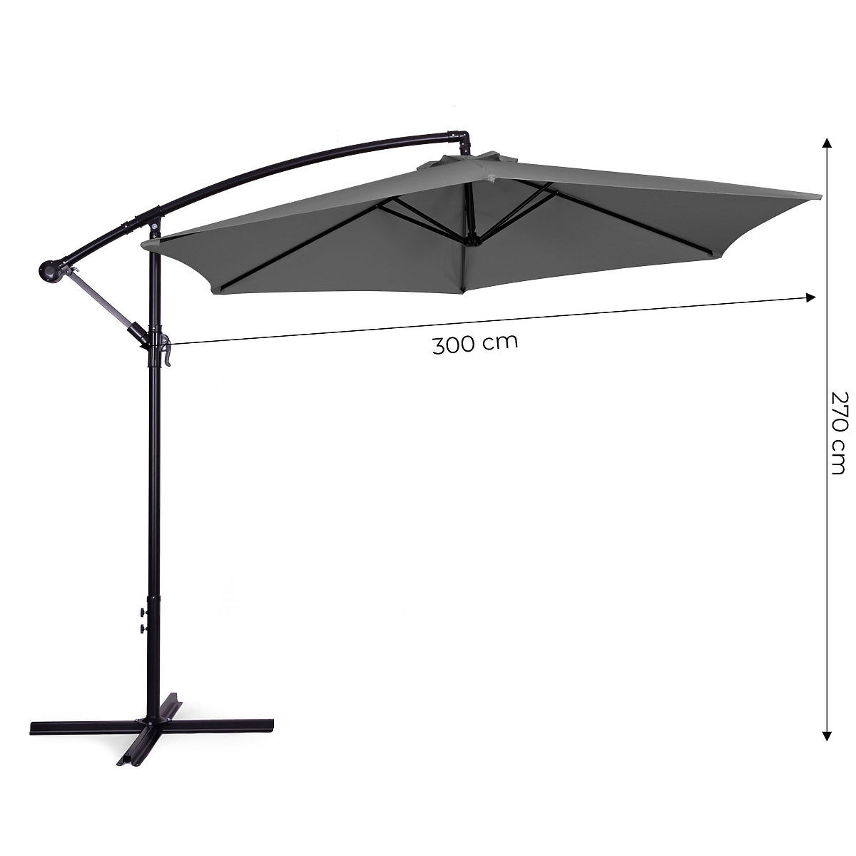 Le parasol repose sur une structure métallique en croix, qui doit être fixée au sol à l'aide de trous spéciaux. Si vous souhaitez installer le parasol sur un sol mou, comme une pelouse, vous pouvez utiliser des poids universels pour parasols de jardin pour bloquer la structure.
