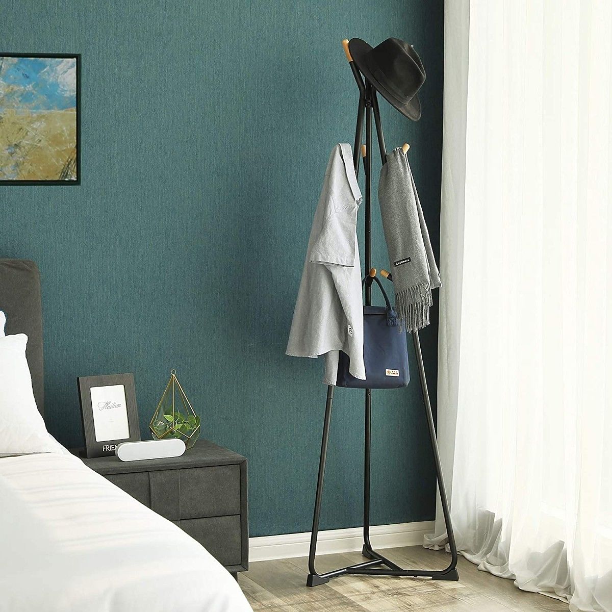 La base triangulaire assure la stabilité du porte-manteau sur pied.