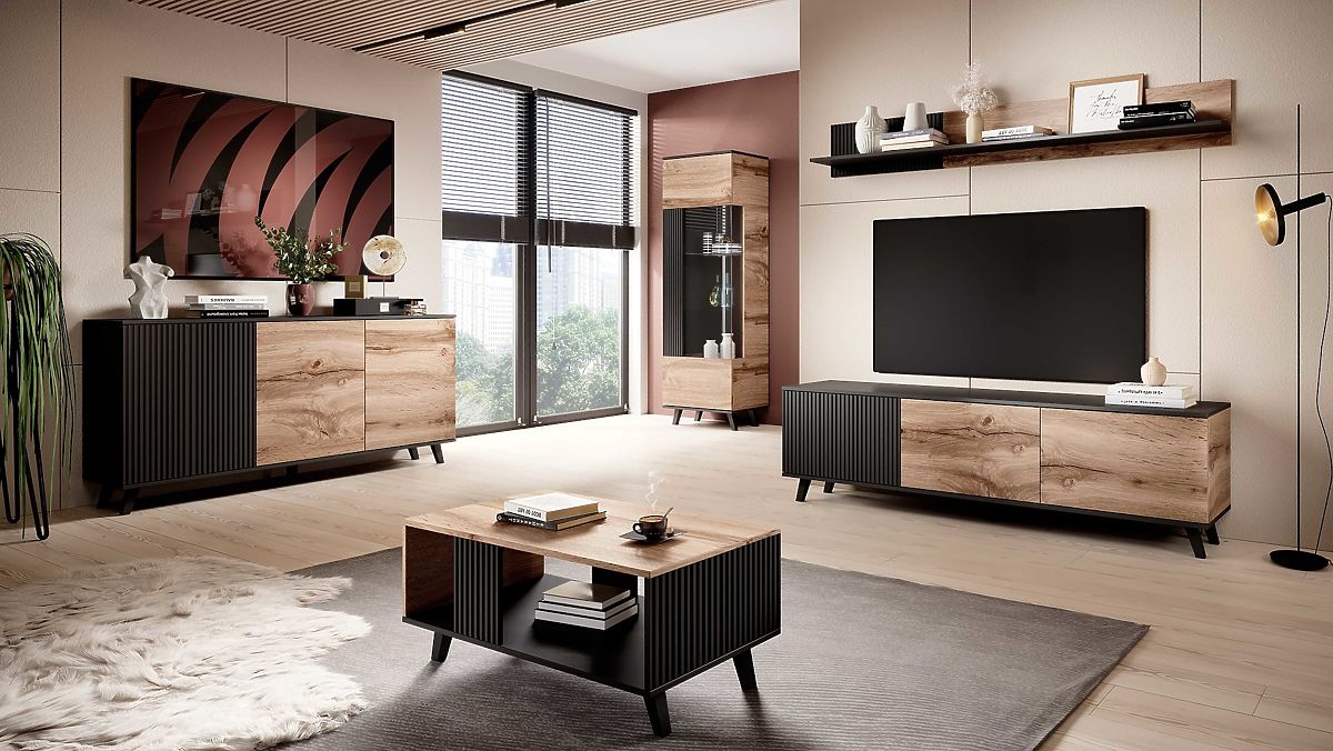 Table basse moderne en chêne wotan et noir pour un salon élégant. .. plus