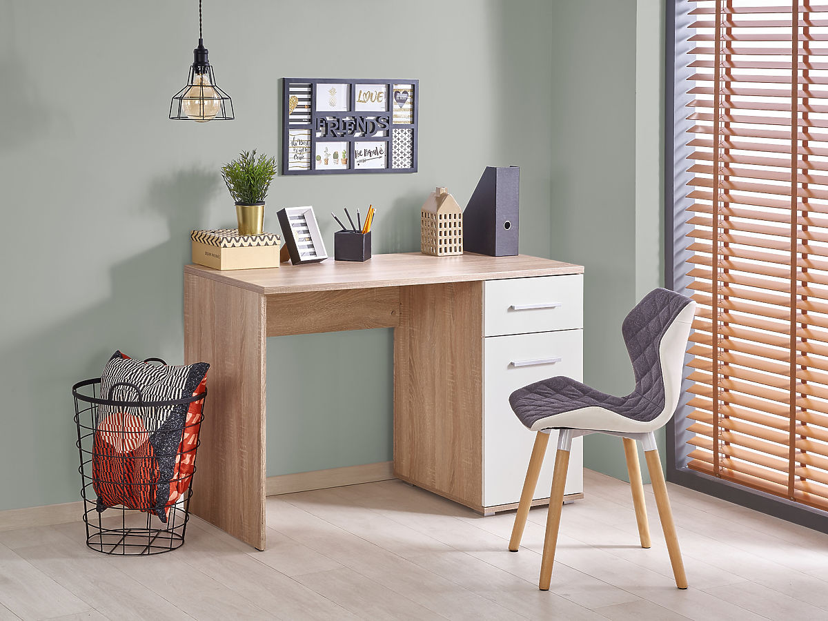 Bureau élégant en couleur chêne sonoma/blanc, qui combine une apparence moderne et des caractéristiques pratiques. Fabriqué en panneau de meuble laminé avec des bords ABS, il est idéal pour un travail efficace et une organisation optimale.