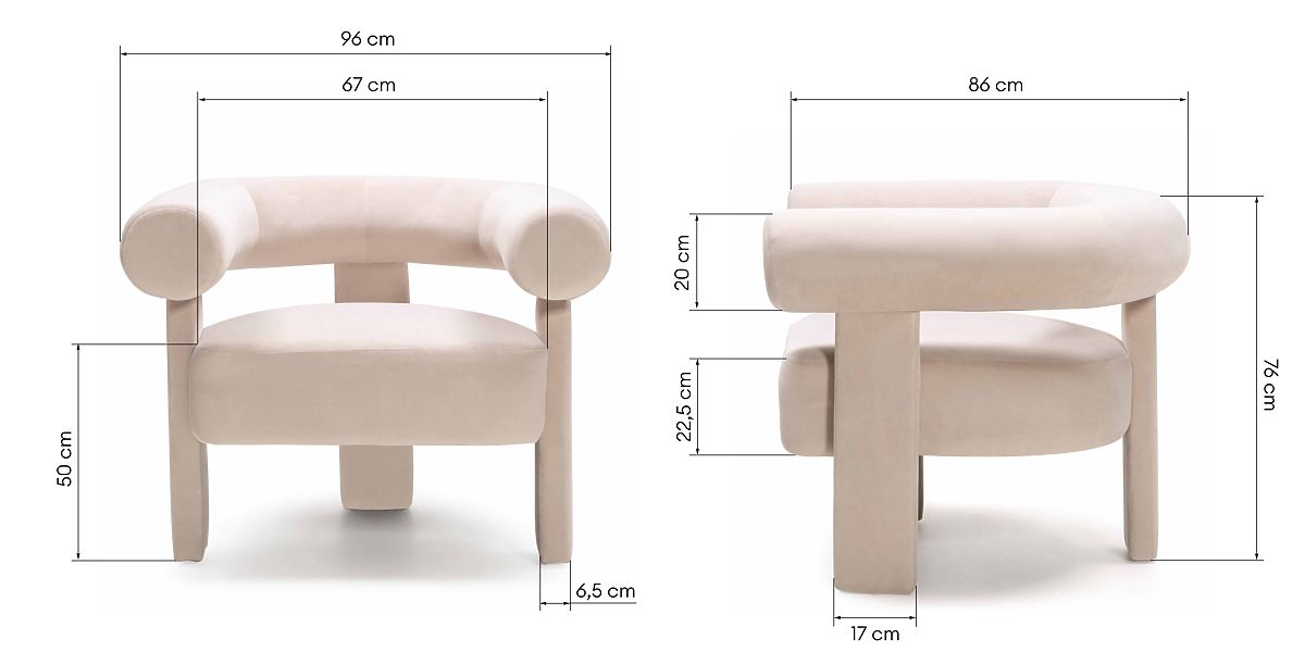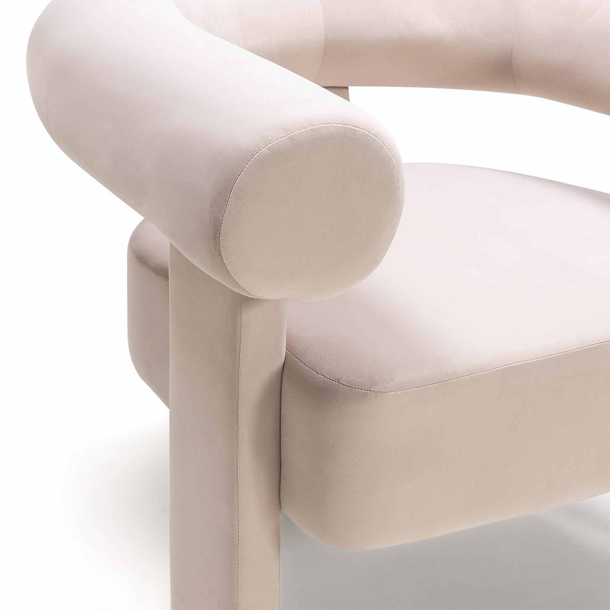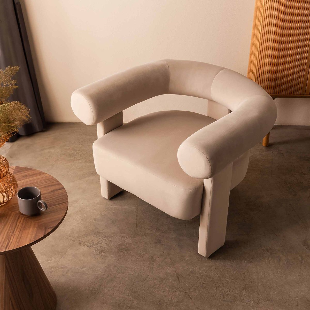 Fauteuil relaxant Hella en velours beige clair avec forme arrondie. .. plus
