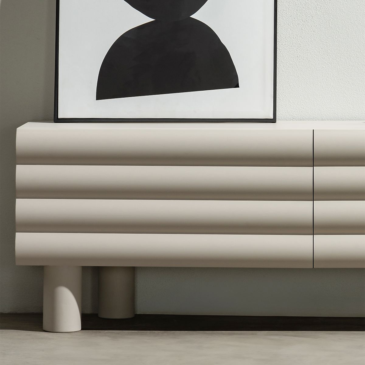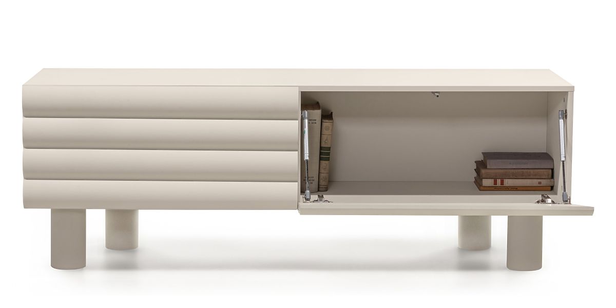 Meuble TV Anatra avec rainures convexes et deux espaces de rangement. .. plus