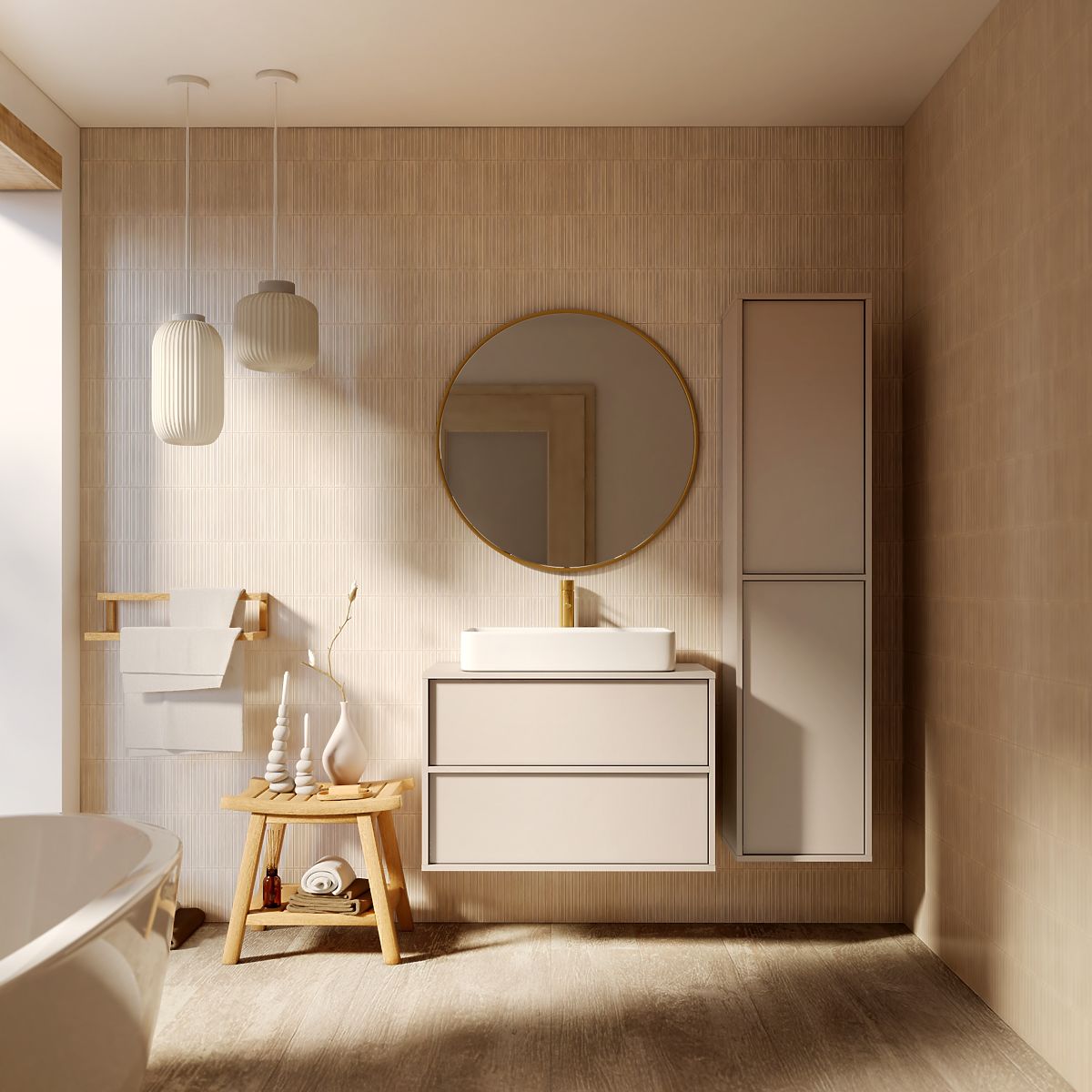 Colonne de salle de bain Mossy avec finition cachemire et étagères spacieuses. .. plus
