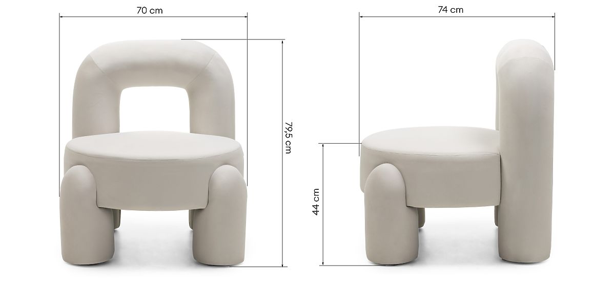 Fauteuil Vasto en velours crème avec formes arrondies. .. plus