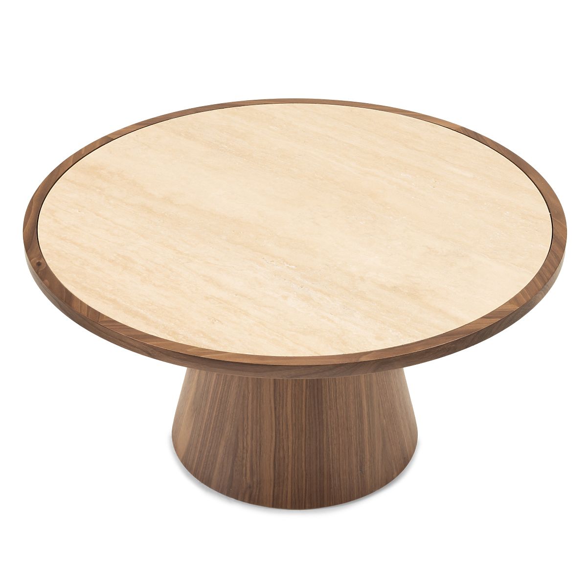 Table basse ronde en travertin et noyer, 80 cm de diamètre. .. plus