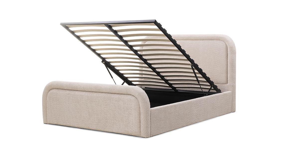 Lit rembourré Ovoid 140x200 cm, avec sommier et espace de rangement, arrondi, beige