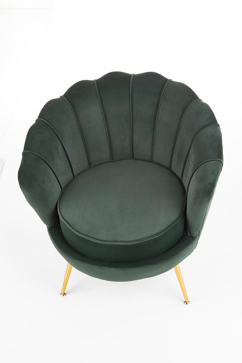 Fauteuil relax en tissu vert foncé avec pieds dorés. .. plus