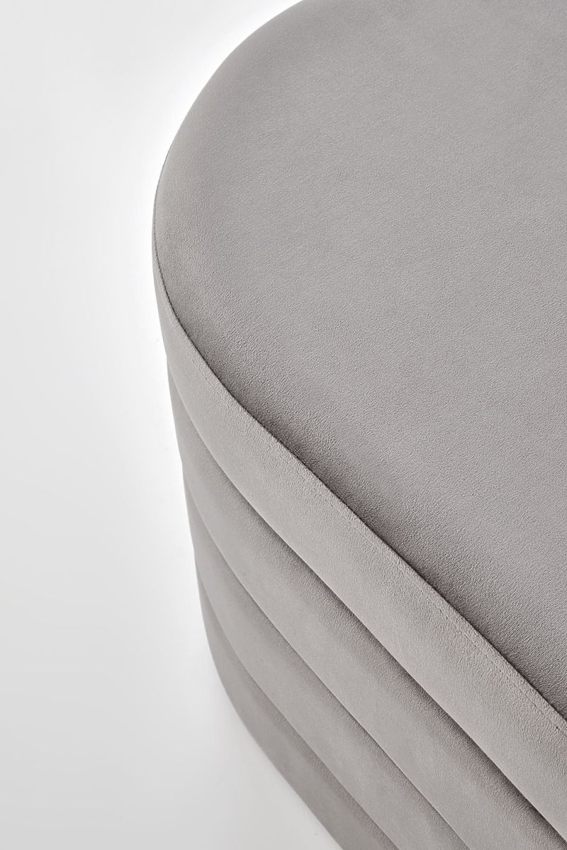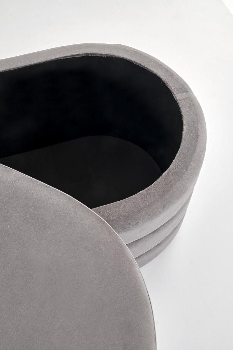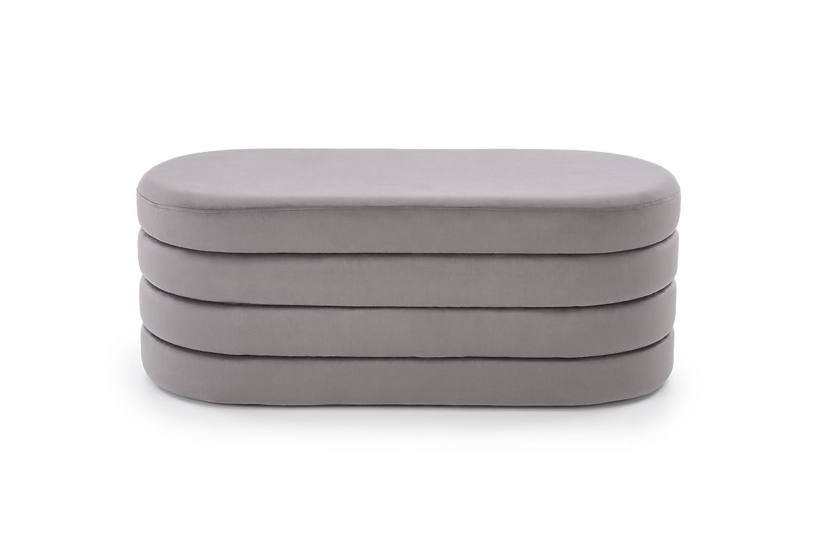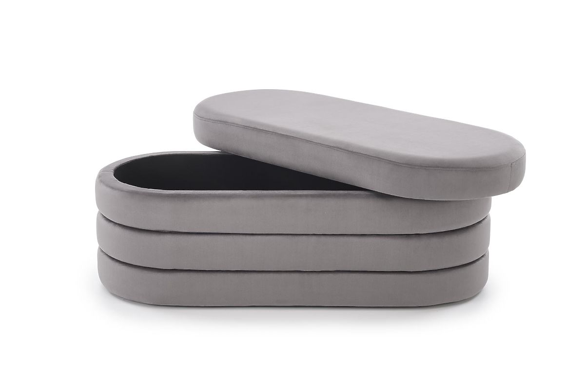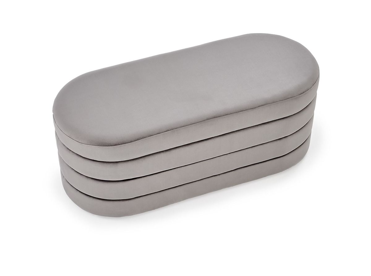 Banc en velours gris avec espace de rangement. .. plus