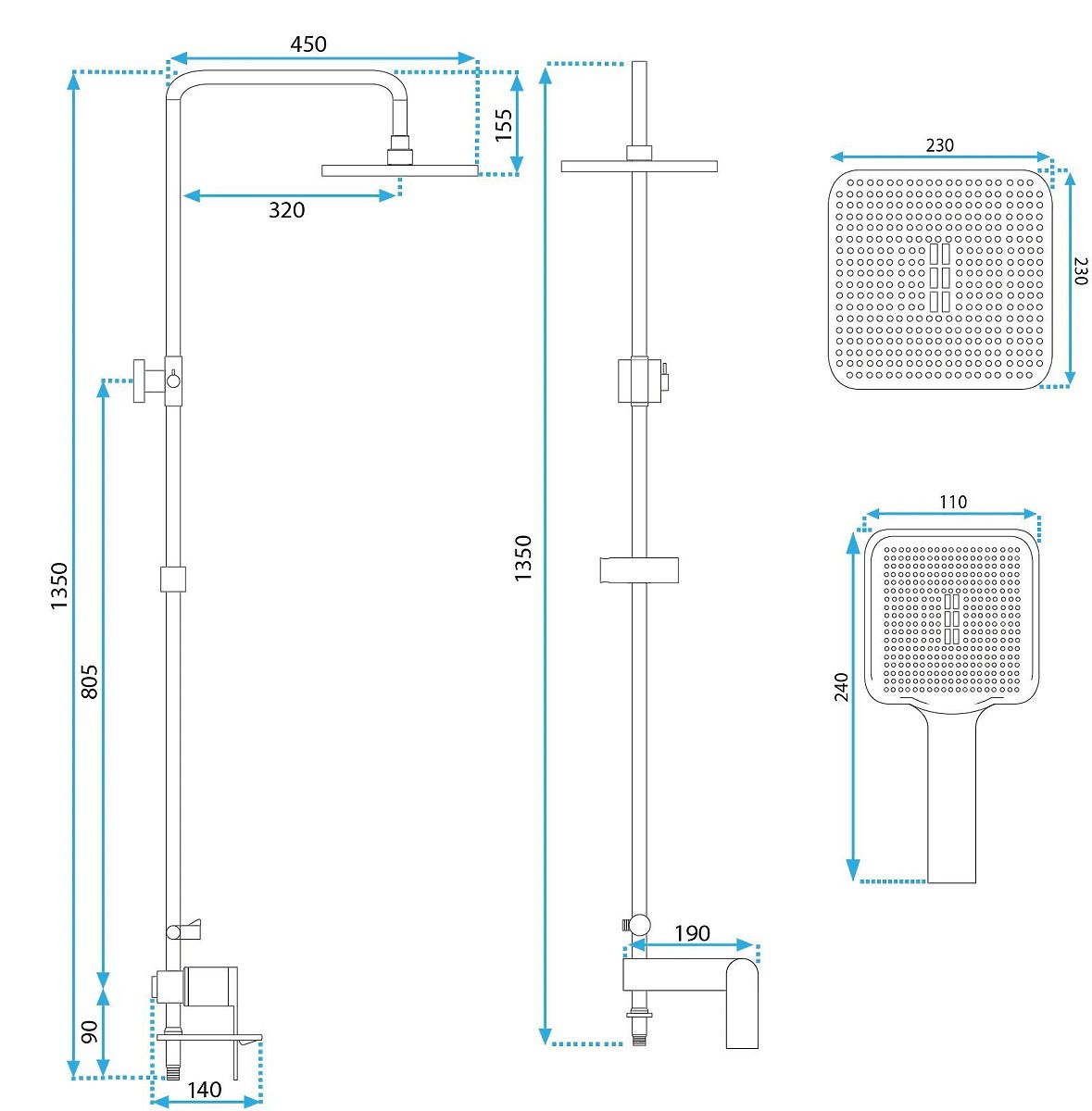 L'ensemble de douche comprend une douche de tête de 20 cm de diamètre, un combiné à jet réglable et un support mural pratique. La hauteur de l'ensemble est de 110 cm et convient à la plupart des cabines et niches de douche.
