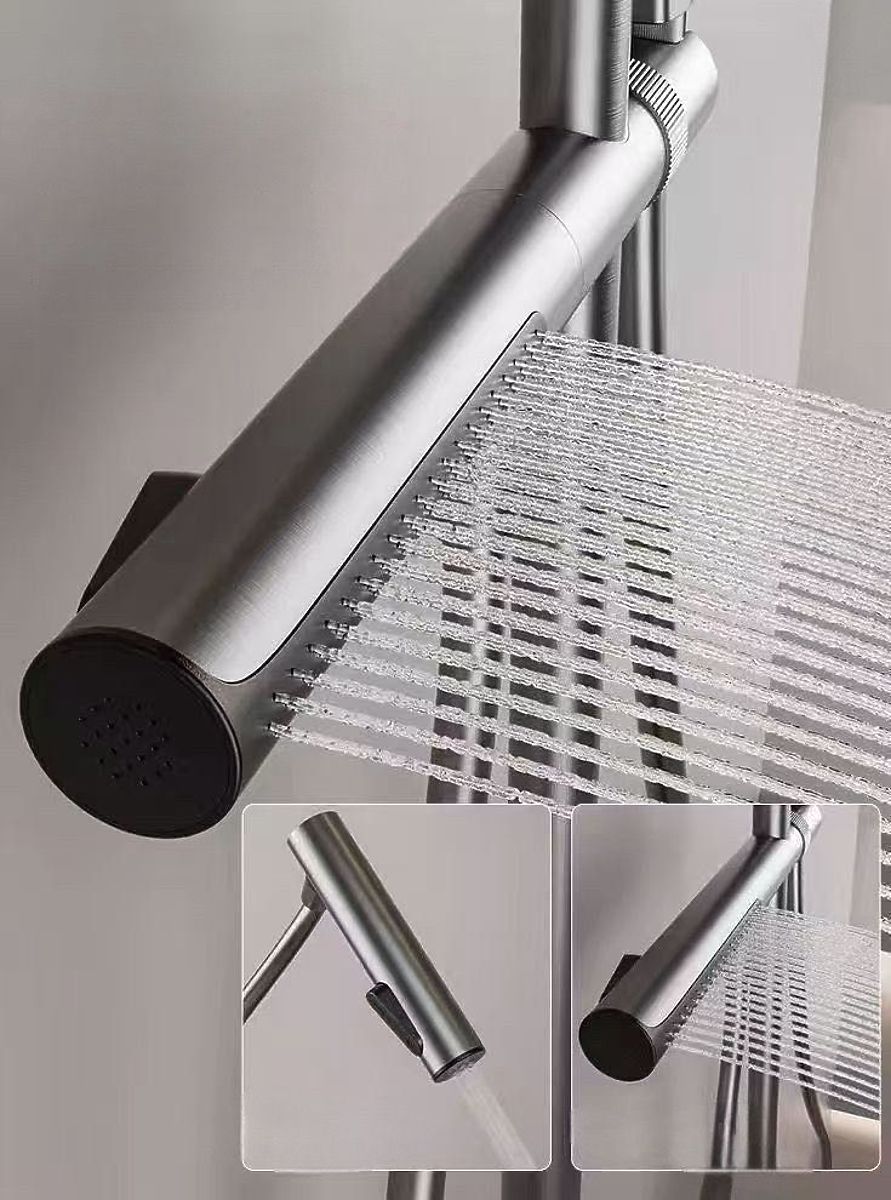 Une attention particulière mérite la fonctionnalité étendue : le support de l'ensemble intègre une pomme de douche extractible à double fonction avec un jet en cascade et latéral, qui peut servir de bidet pratique. De plus, l'ensemble comprend une pomme de douche classique au design moderne - équipée d'un commutateur de jet d'eau et d'une douche de pluie.