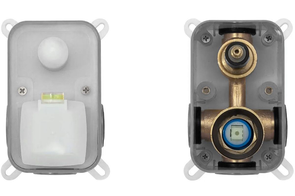 Un autre avantage de l'ensemble est le système Boîte, qui permet une installation rapide et facile du mitigeur encastré. Fabriqué en plastique et en éléments en laiton, il assure fiabilité et longévité. La boîte est équipée d'une partie de couverture qui protège les éléments internes pendant l'installation, et un niveau à bulle intégré permet un réglage précis. Le système facilite également l'accès aux composants internes après l'installation, rendant l'entretien simple et sans souci.