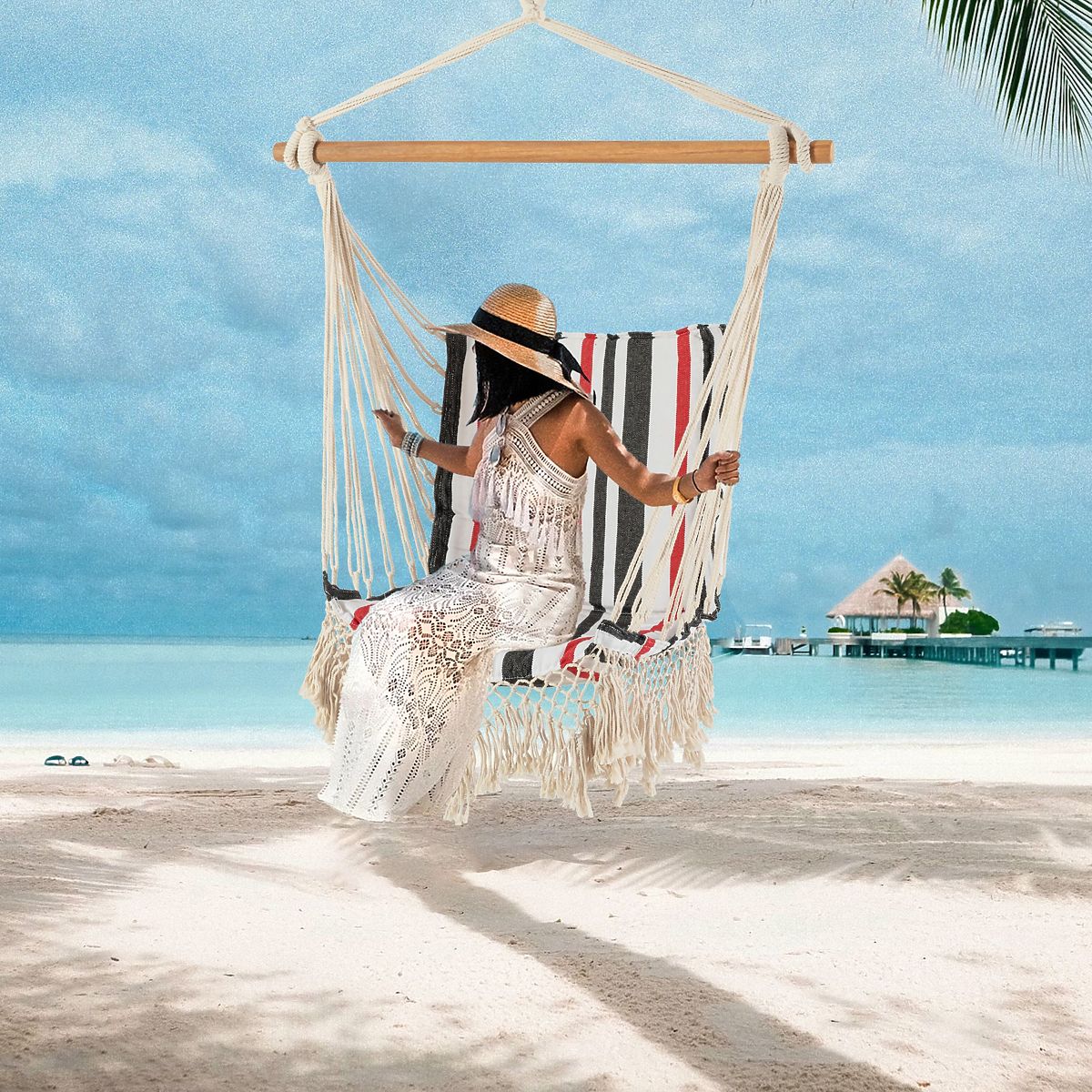 Un endroit exceptionnellement confortable et fiable pour se détendre ! Vous pouvez vous y relaxer, boire un café, lire un livre ou vous endormir. Vous souhaitez éveiller l'imagination de vos enfants et leur envie de jouer en plein air ? Commandez un hamac pour vous et les membres de votre famille ! Le hamac est très confortable - fabriqué en coton, il s'adapte exactement à votre position assise souhaitée. Aucune corde ni couture ne vous gêne. Deux coussins en coton sont également inclus dans l'emballage.