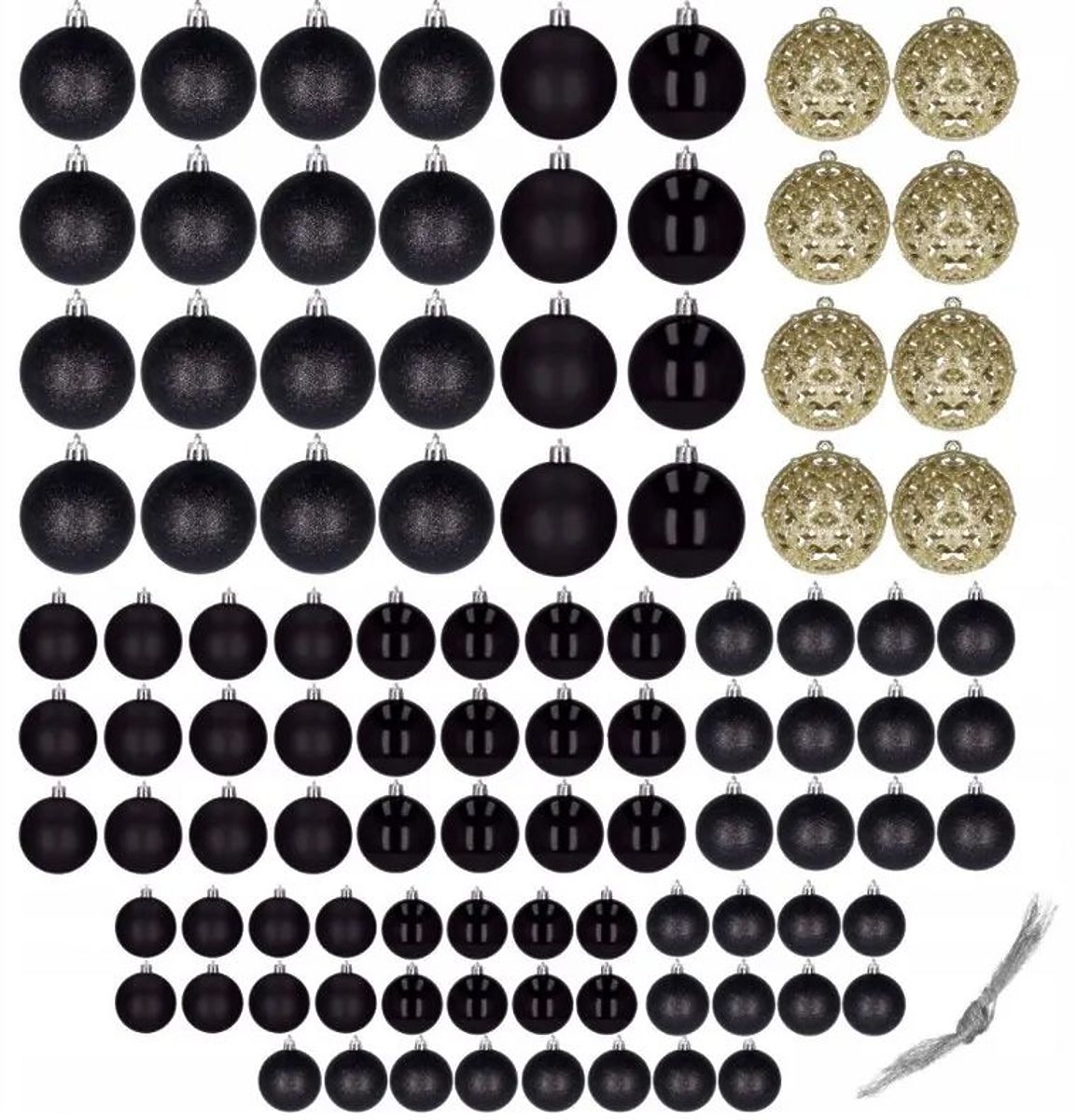 Nous vous présentons un ensemble de boules de Noël en plastique avec différentes finitions, qui enrichiront l'apparence de votre sapin de Noël. Les boules sont magnifiques sur l'arbre et résistantes aux chocs, vous permettant de passer les fêtes en toute tranquillité, sans souci pour les décorations de Noël. Créez une atmosphère magique de Noël pour tous. Les boules de Noël sont un élément indispensable de la décoration du sapin, permettant de ressentir l'atmosphère et la magie de Noël. L'ensemble présenté contient jusqu'à 100 pièces, suffisant pour décorer un sapin standard et, combiné avec des lumières, crée un effet merveilleux. Les boules sont disponibles en deux couleurs : noir et or. Ce duo est très élégant, original et attire immédiatement l'attention. De plus, les boules de Noël noires ont différentes finitions - de mate, brillante à scintillante. Chacune d'elles s'accorde parfaitement, créant un ensemble harmonieux et une décoration à la mode. Les boules présentées peuvent être accrochées avec succès non seulement sur un sapin vert traditionnel, mais aussi sur un blanc, comme s'il était couvert de neige. En outre, elles diffèrent par leur taille. L'ensemble comprend trois tailles : des boules de 6 et 4 centimètres de diamètre, ainsi que les plus petites, mesurant seulement 3 centimètres. Cela rend toute la décoration du sapin exceptionnelle et inhabituelle. Les boules de Noël noires sont fabriquées en plastique et PVC, ce qui les rend résistantes aux chocs. Elles conviennent parfaitement partout où il y a de jeunes enfants et des animaux. Même si elles tombent de haut, elles ne se cassent pas - vous pouvez donc les replacer sans problème sur une branche. Un sapin avec des boules noires est une belle décoration pour tout intérieur, quel que soit le style dans lequel il est aménagé. Non seulement glamour ou moderne, mais aussi loft et traditionnel. Il vaut la peine de se laisser séduire par des solutions non standard.