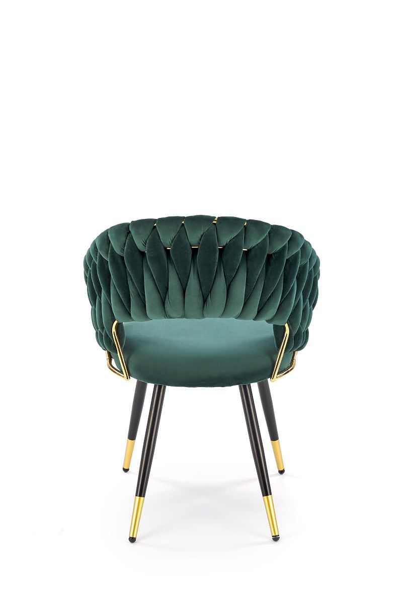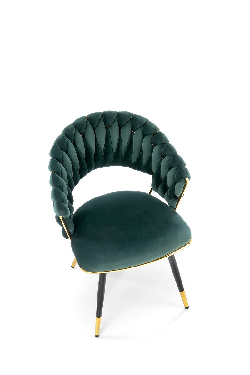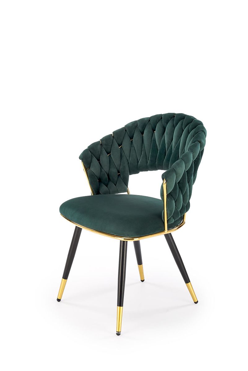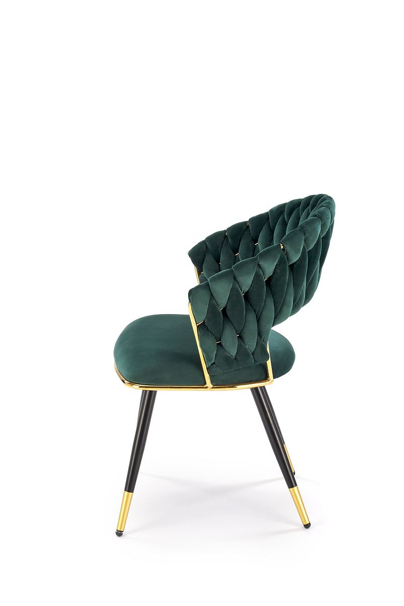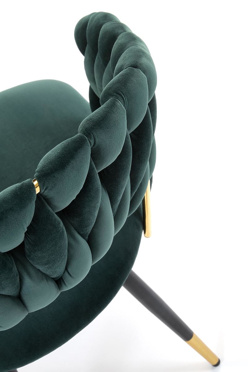 Chaise en velours vert foncé avec structure en acier doré. .. plus