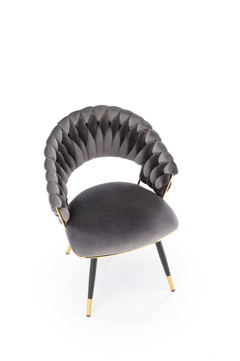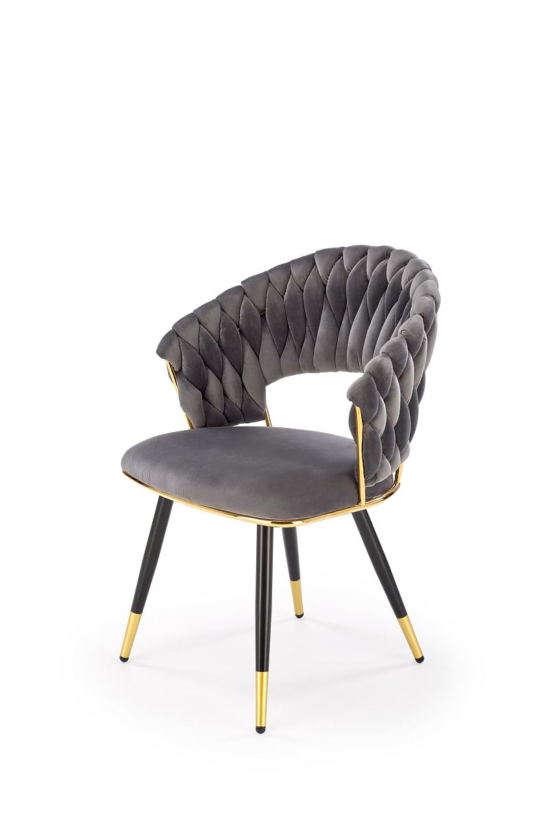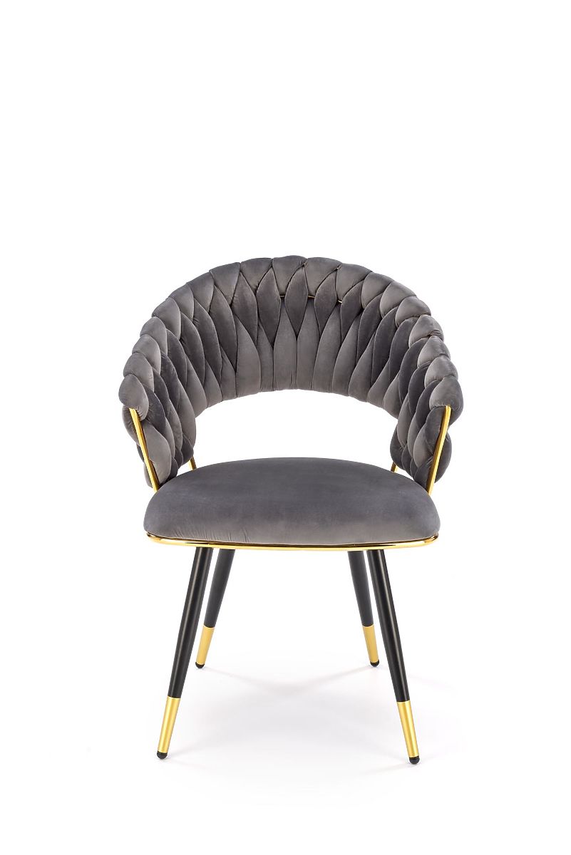 Chaise grise en velours avec structure en acier doré. .. plus
