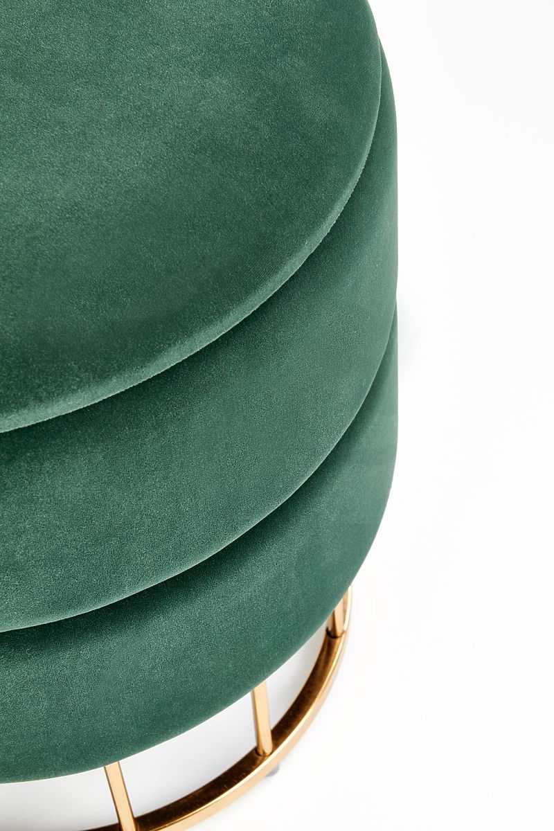 Pouf en tissu vert foncé avec base en acier chromé doré. .. plus