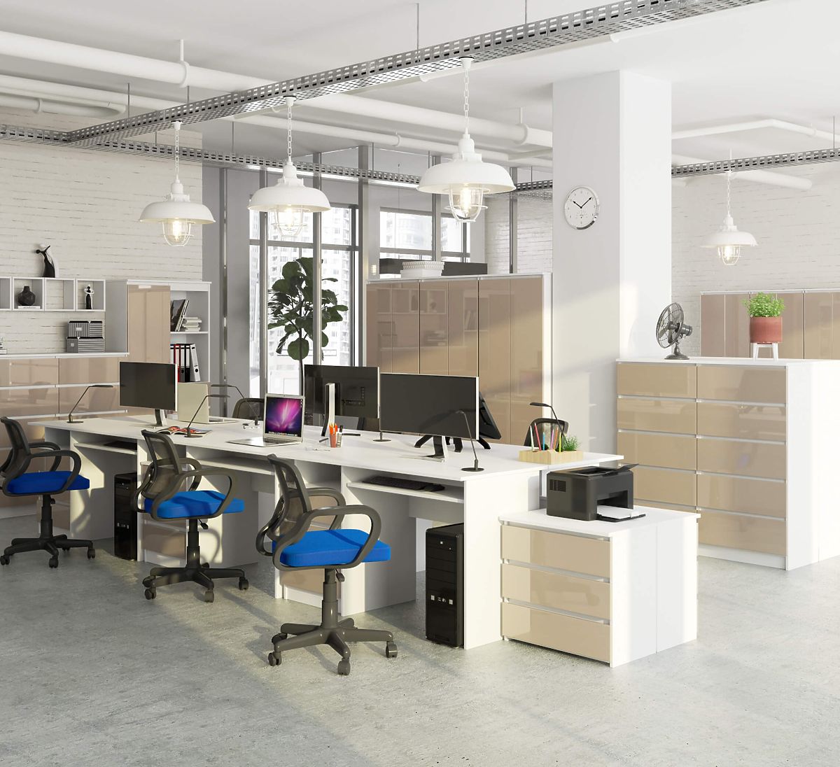 Bureau blanc avec tiroirs cappuccino brillant et espace clavier coulissant. .. plus