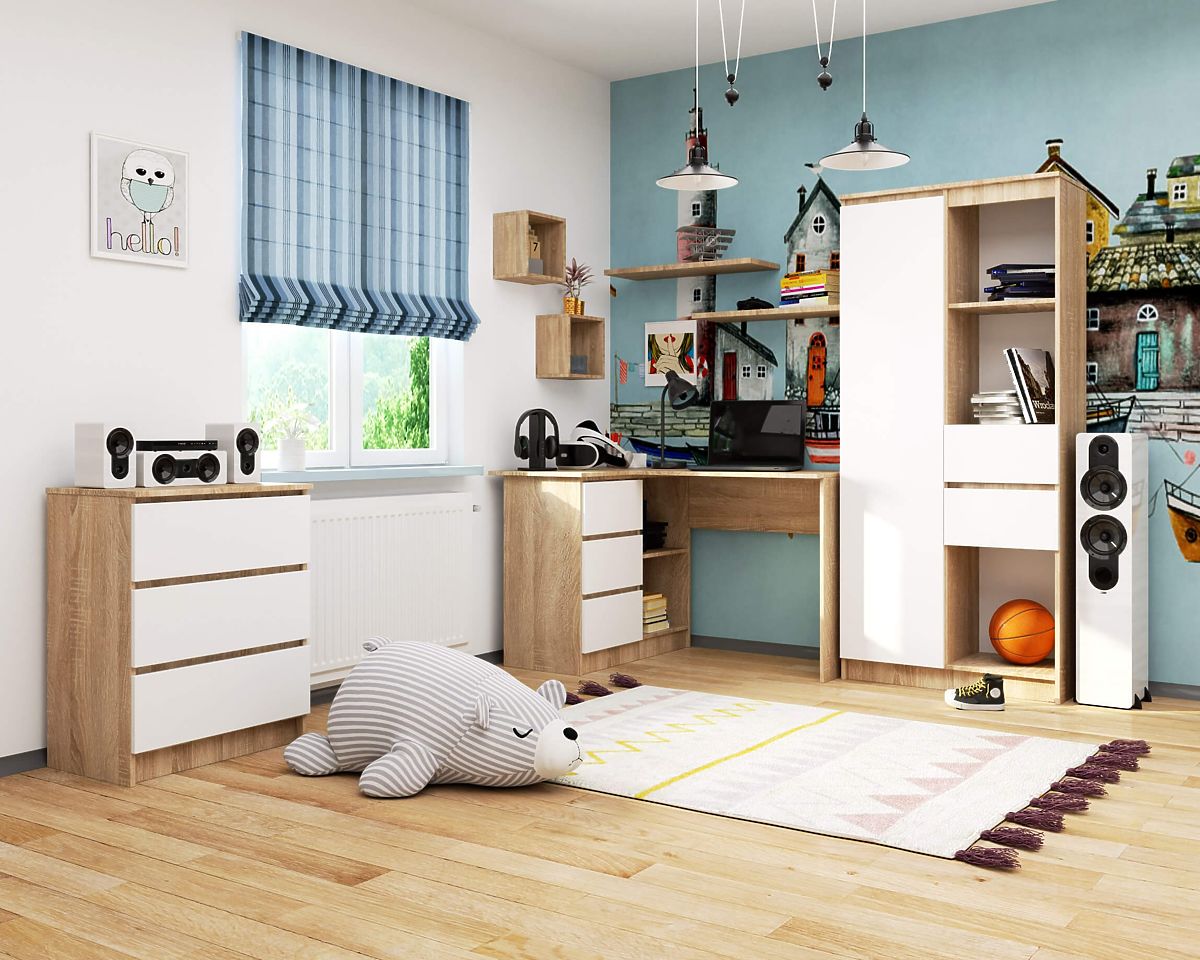Le bureau d'angle équipé de trois tiroirs est une offre intéressante pour ceux qui préfèrent des intérieurs de bureau modernes. C'est une combinaison subtile de blanc classique et de la couleur très tendance du chêne sonoma. Le mobilier se compose d'un bureau, de deux armoires ouvertes et de tiroirs. Cette offre présentée s'intègre bien dans tout bureau où l'utilisation fonctionnelle de l'espace est primordiale. Un panneau stratifié de 16 millimètres d'épaisseur a été utilisé pour la fabrication - un matériau durable avec une haute résistance aux dommages. Le bureau d'angle pour ordinateur satisfera certainement même les clients les plus exigeants, pour qui l'apparence, la qualité et la fonctionnalité sont importantes. Nous vous invitons également à découvrir d'autres meubles de cette collection - commodes, étagères et armoires, disponibles dans la même combinaison de couleurs. Grâce à eux, il sera certainement possible de créer un espace adapté pour le travail de bureau ou l'étude - à la maison comme au bureau.