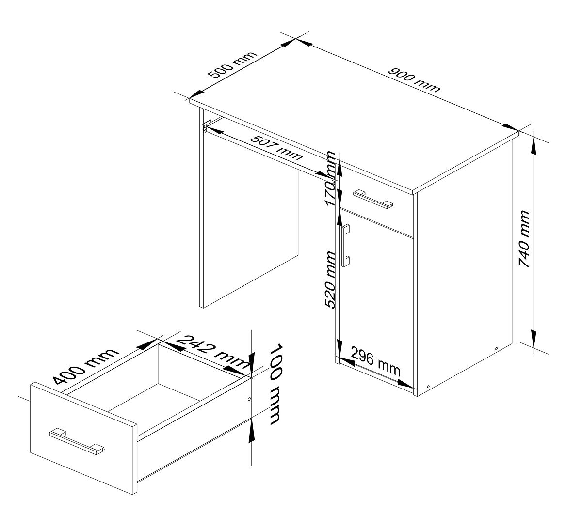 - Les tiroirs et l'étagère pour le clavier se déplacent sur des glissières à rouleaux métalliques