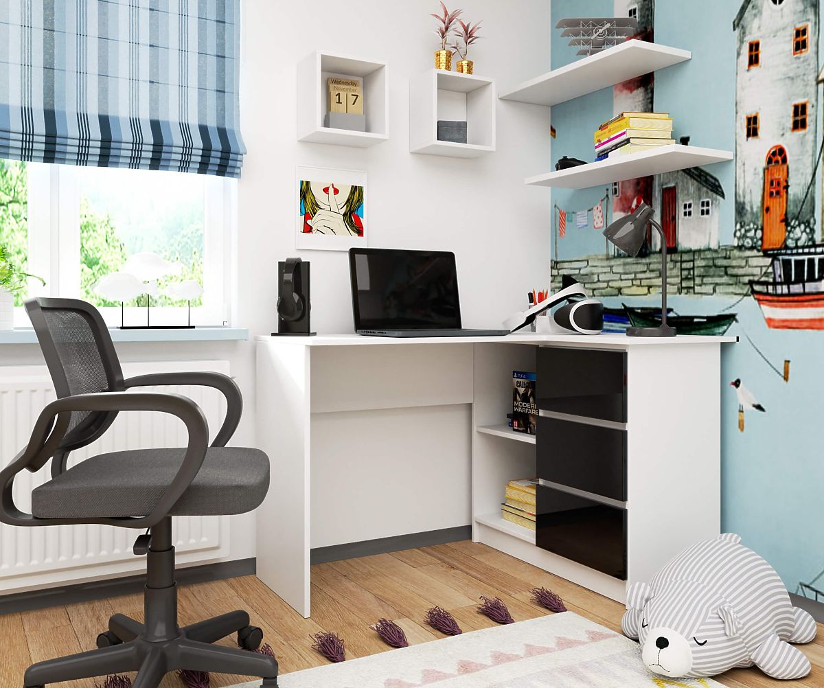 Pour les joueurs, les étudiants cherchant un espace d'étude et les adultes travaillant à domicile, un bureau informatique confortable avec trois tiroirs est recommandé. La structure du meuble est en panneau stratifié de 16 mm, très résistant à l'usure. Les faces avant des portes sont fabriquées en technologie acrylique, ce qui signifie qu'elles ont le plus haut standard de brillance parmi les meubles similaires. Grâce à ses dimensions adaptées, le bureau offre une grande capacité de rangement pour d'autres accessoires. Les systèmes de tiroirs sont montés sur des rails à rouleaux métalliques qui ne se bloquent pas pendant l'utilisation. De plus, les bords du bureau sont protégés par une bande ABS, augmentant leur résistance et leur résistance aux dommages mécaniques. Le fabricant propose le meuble en version à monter soi-même, un manuel de montage clair est fourni avec le produit commandé. La période de garantie pour le bureau d'angle commandé est de 24 mois à compter de l'achat.