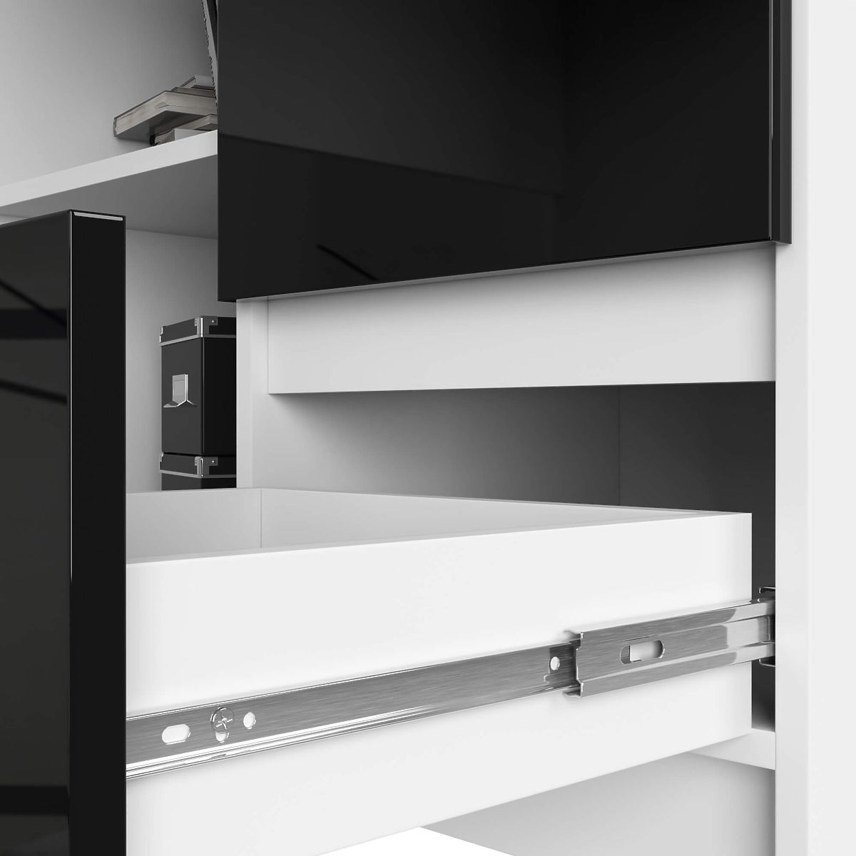 - Les tiroirs se déplacent sur des rails à rouleaux métalliques