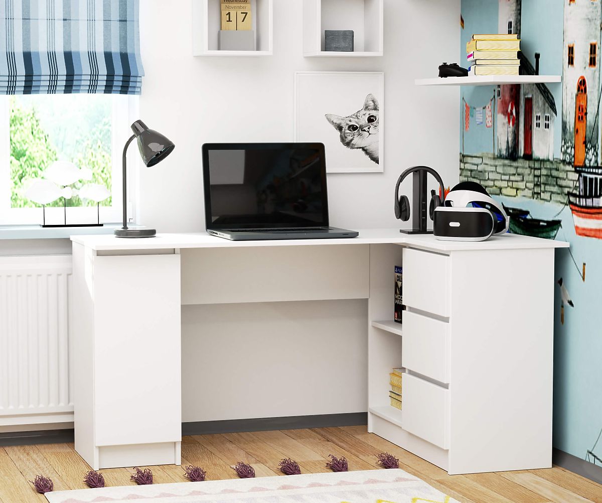 Le bureau d'angle blanc est une proposition moderne créée en réponse aux besoins des jeunes qui recherchent constamment des solutions innovantes, fonctionnelles et esthétiques. Le bureau d'angle pour ordinateur avec armoire et tiroirs s'avère être un choix parfait pour ceux qui aménagent leur bureau. Le mobilier conçu dans une couleur blanche universelle surprendra certainement par son design unique et sa fabrication solide. La construction durable et le projet original méritent l'attention, car ils remplissent bien l'espace et l'utilisent à cent pour cent. Le bureau d'angle blanc offre avant tout une grande surface de travail et des tiroirs et une armoire pratiques pour ranger tous les accessoires nécessaires. De plus, le mobilier est disponible à un prix très compétitif, ce qui est également un avantage indéniable. Nous recommandons également d'explorer d'autres propositions de mobilier qui se marient parfaitement avec le bureau et permettent de créer un aménagement moderne.