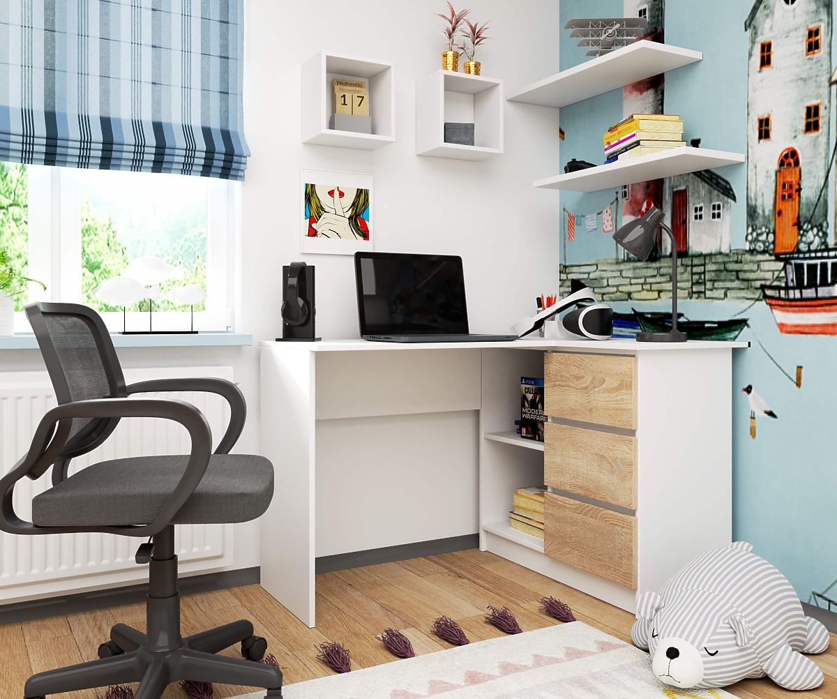 Le bureau d'angle est un choix intéressant tant pour les espaces résidentiels que pour les bureaux d'entreprise. Il prend peu de place et permet de ranger tous les accessoires de bureau nécessaires. Il offre également un espace pour travailler ou étudier, constituant ainsi un poste de travail informatique idéal. Le bureau d'angle blanc avec trois tiroirs aux façades couleur chêne sonoma est une offre moderne destinée aux jeunes soucieux de tous les détails. Sa construction solide assure durabilité et les matériaux de haute qualité utilisés dans sa fabrication, comme le panneau laminé de 16 millimètres d'épaisseur, garantissent une résistance aux dommages. Produit attractif en termes de prix, il séduit par sa qualité et son design. Nous vous recommandons également de découvrir d'autres offres de cette collection, telles que des commodes, armoires, étagères et bien d'autres. Grâce à elles, vous pouvez aménager un espace de bureau efficace et pratique tant chez vous qu'en entreprise. Nous vous invitons à découvrir notre offre.