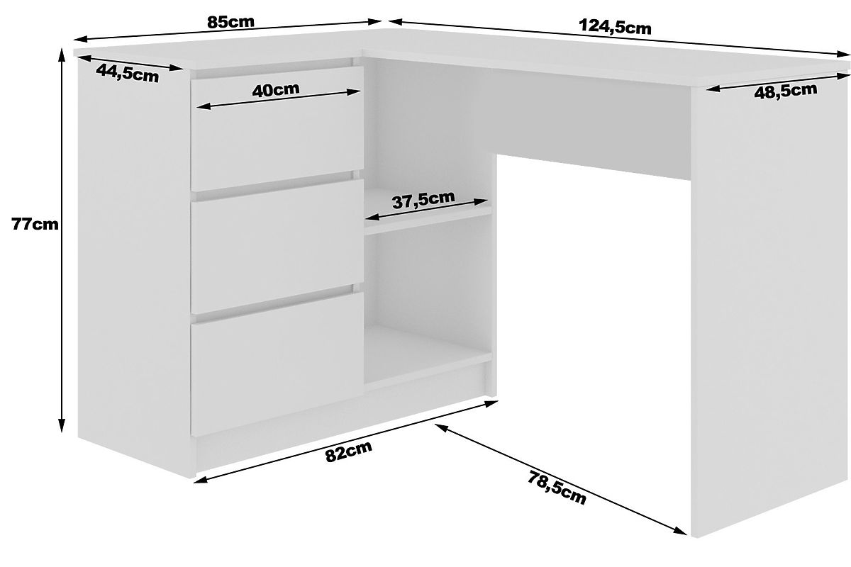 Comment choisir un bureau pour une chambre d'adolescent ? Principalement en fonction de la fonctionnalité. La chambre d'un adolescent doit remplir de nombreuses fonctions diverses, offrant un espace à la fois pour l'apprentissage et le divertissement. Le bureau d'angle informatique que nous avons l'honneur de présenter est une proposition moderne créée sur mesure pour les besoins des jeunes. Il se caractérise par une construction solide et un panneau laminé de qualité utilisé lors de la fabrication. Il est durable et résistant aux rayures. Facile à nettoyer, le bureau se distingue également par un aspect intéressant qui plaira certainement aux adolescents. L'offre est disponible à un prix compétitif. Le produit présenté convient parfaitement non seulement à une chambre d'adolescent, mais aussi à une chambre d'enfant ou à un bureau à domicile. Il peut également être utilisé dans un bureau, où il séduira par son utilisation pratique, son grand espace pour un aménagement individuel et son design universel et intemporel. Nous vous invitons à l'achat.