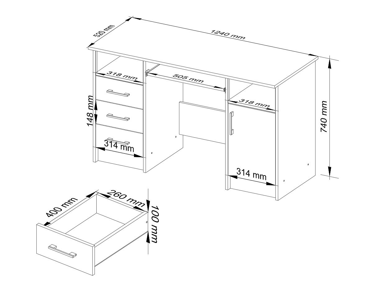 Fabriqué en panneau stratifié résistant à l'usure. Le plateau, les côtés et les façades sont bordés d'un chant ABS. Il dispose d'une étagère coulissante pour le clavier, de 3 tiroirs et d'une porte avec des façades en panneau stratifié.